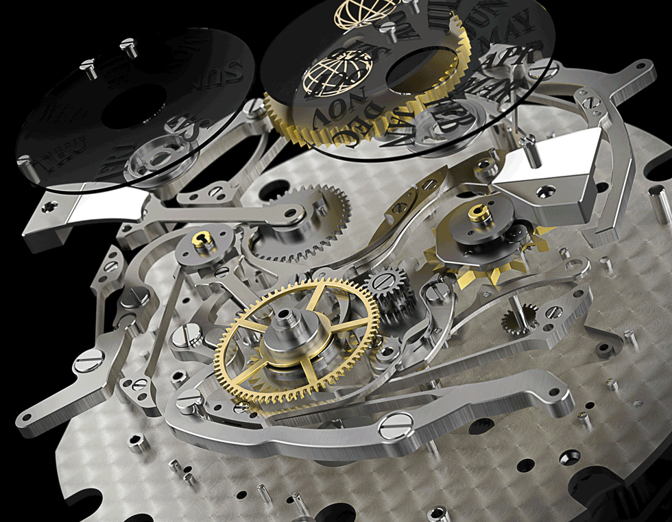 - Este movimiento que incorpora 22 complicaciones, 923 componentes individuales, así como cuatro martillos y gongs que producen 433,580 notas cada año en el curso de 35,040 activaciones.