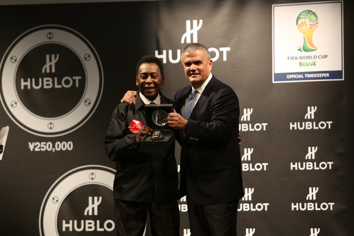 Pelé y Ricardo Guadalupe, CEO de Hublot, en la presentación del reloj oficial de la Copa del Mundo, Brasil 2014.