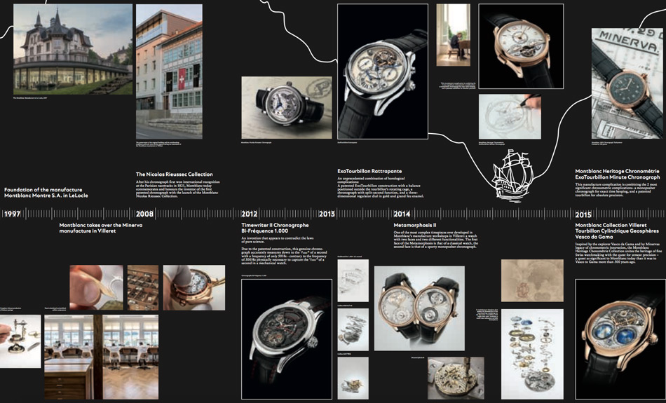 En 1997, la pasión por el trabajo artesanal que nació en Hamburgo hace 110 años se extendió hacia la relojería, con la inauguración de una manufactura en Le Locle, Suiza. Ahí Montblanc siguió todos sus principios fundadores y los aplicó hacia la producción de relojes Swiss made, para posteriormente, con el establecimiento de la manufactura Montblanc en Villeret, perpetuar en ricas tradiciones relojeras que hoy en día se añaden a piezas de excelencia para rebasar los límites de lo esperado, siempre por medio de un espíritu puramente pionero.