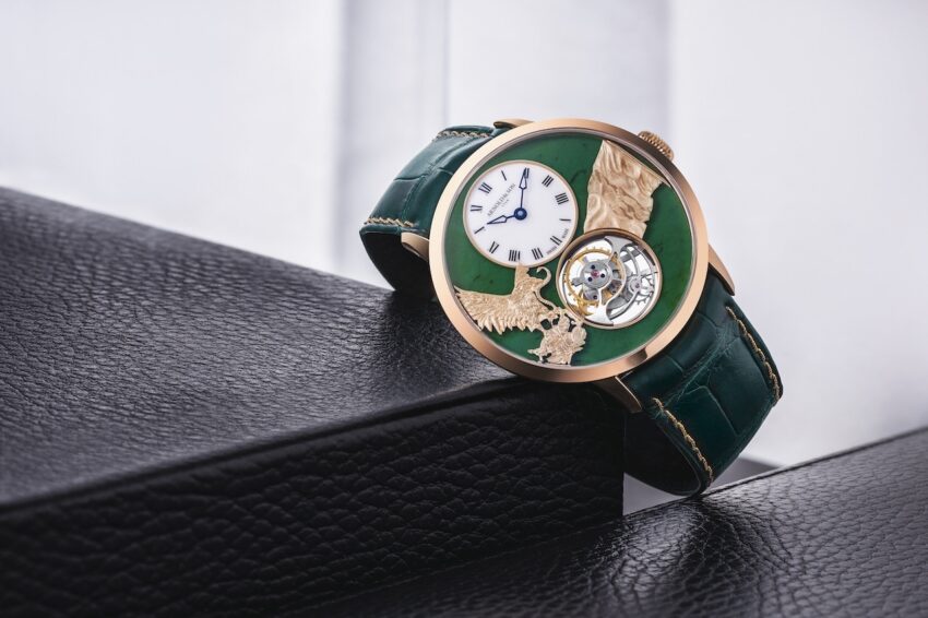 Arnold & Son es sin lugar a dudas uno de los grandes referentes de Alta Relojería en México. El Ultrathin Tourbillon Icons Of Mexico refleja a la perfección su indiscutible talento relojero. La marca adapta en su calibre A&S8200 en una altura de tan sólo 2.97 mm un tourbillon volante de carga manual. Además presenta una mini carátula en opalina blanca rodeada de jade Wyoming en verde intenso. Para terminar, tanto el águila como la bandera, dos de nuestros símbolos patrios más importantes, se labraron en oro rosado de 18 quilates completamente a mano. A combinación con la caja también en oro rosado de 42 mm, este ejemplar único es un homenaje muy especial a nuestros iconos patrios.