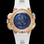 Las seis iteraciones de este reloj se dividen en dos materiales. Cuatro vienen en oro ya sea rosado o blanco, y las dos últimas en titanio. Los colores primarios dominan las opciones en la carátula. El azul, verde y rojo hacen juego con el color blanco de la pulsera de caucho calada que permite la ventilación y un uso extremadamente cómodo. Además, está el brillo de los diamantes.