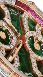 Parte del encanto de la colección es que cuenta con un calibre de cronógrafo automático muy especial. Bautizado como JCAA05, expone sus 260 componentes decorados con los estándares que solo Jacob & Co puede entregar.