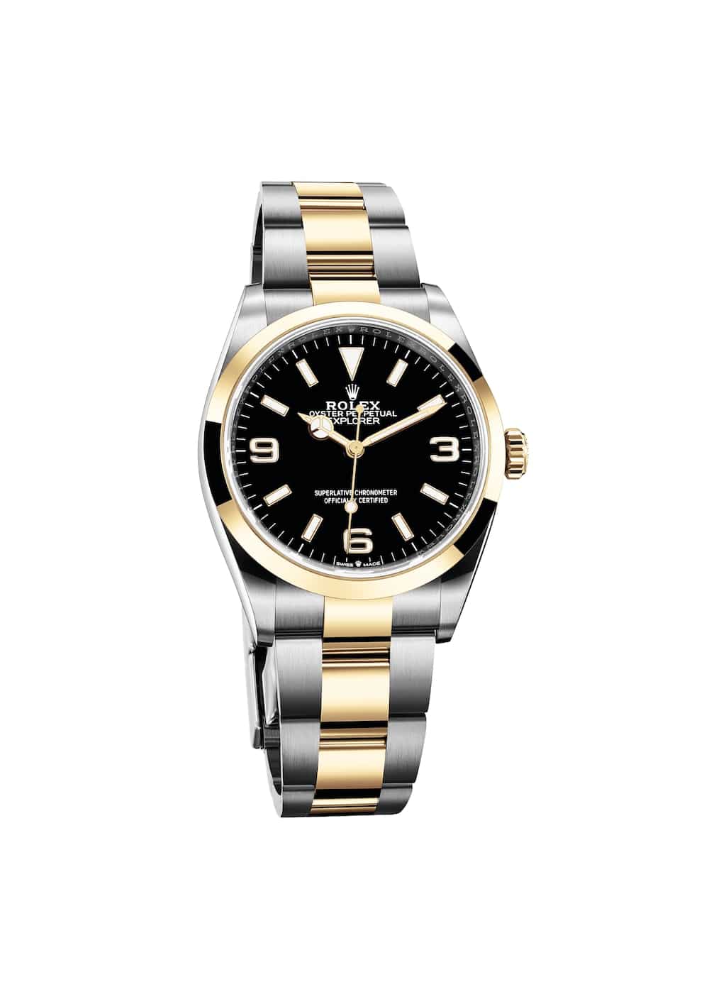 El nuevo Explorer de 36 mm viene en acero Oystersteel (124270) o Rolesor de acero y oro (124273). La carátula permanece lacada en negro sólido con indicadores aplicados de hora tipo bastón y los conocidos números arábigos 3, 6 y 9 cubiertos de tratamiento Chromalight. En el modelo Oystersteel, las agujas y los índices son de oro blanco, mientras que en el nuevo Rolex Explorer 1 Rolesor de 36 mm están hechos de oro amarillo.