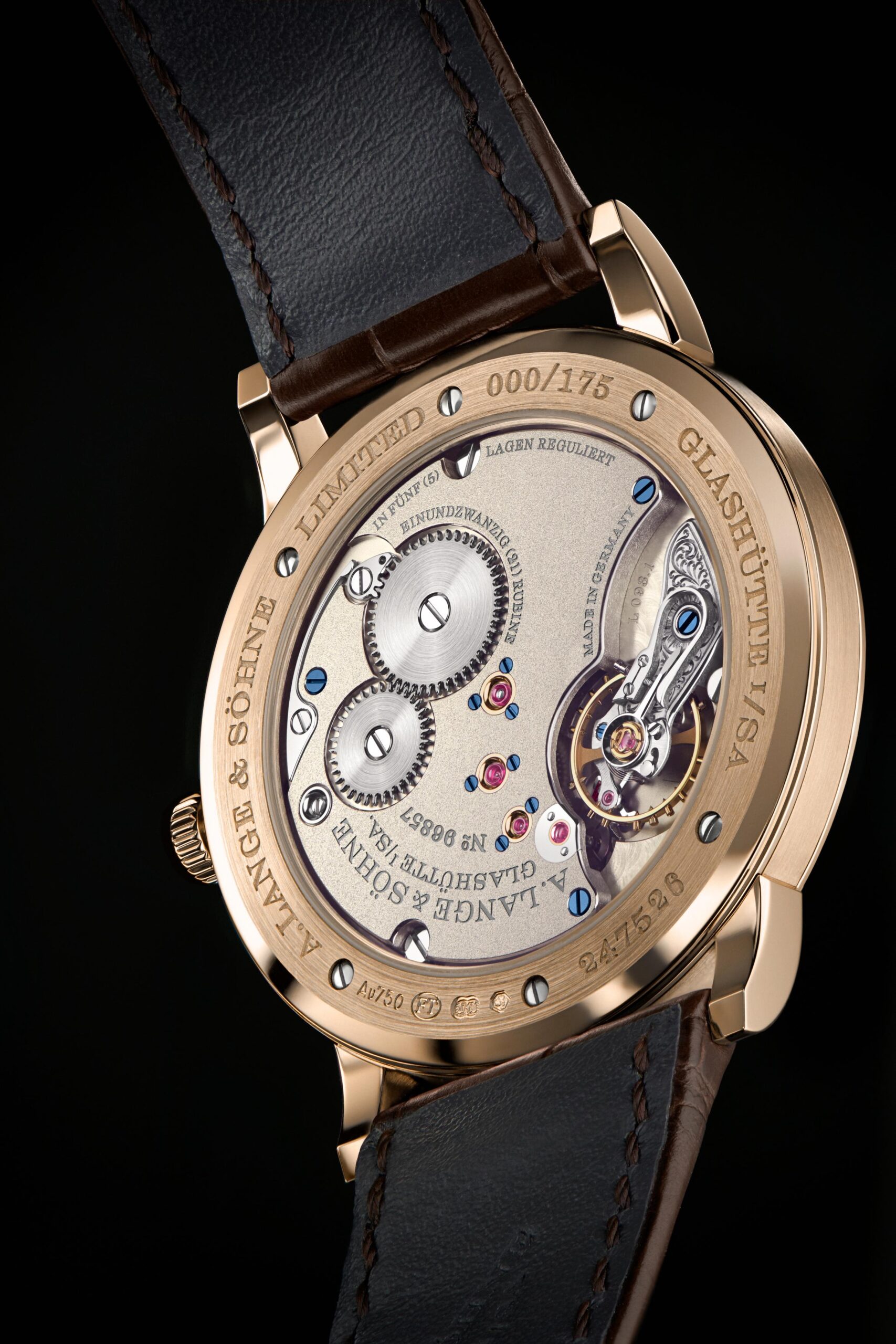 A diferencia de las nervaduras Glashütte que se utilizan comúnmente en otros modelos Lange, la placa de tres cuartos de plata alemana tiene una textura de superficie granular que a menudo se encuentra en los históricos relojes de bolsillo Lange. La corona y las ruedas de trinquete están visiblemente integradas en el puente del tren y decoradas con vetas circulares perfectamente ejecutadas. Los chatones de oro asegurados por tres tornillos azulados –térmicamente– trazan el camino de la energía transmitida desde el barrilete hasta el escape. El grabado a mano alzada en el puente de balance es el elemento característico de todos los calibres manufactura de Lange. Mientras que las finas líneas del estampado floral están rodiadas en negro, al igual que la inscripción de la platina. El tono oscuro del revestimiento galvánico se hace eco del gris de las huellas de la carátula y al mismo tiempo amplifica el efecto tridimensional de los grabados.