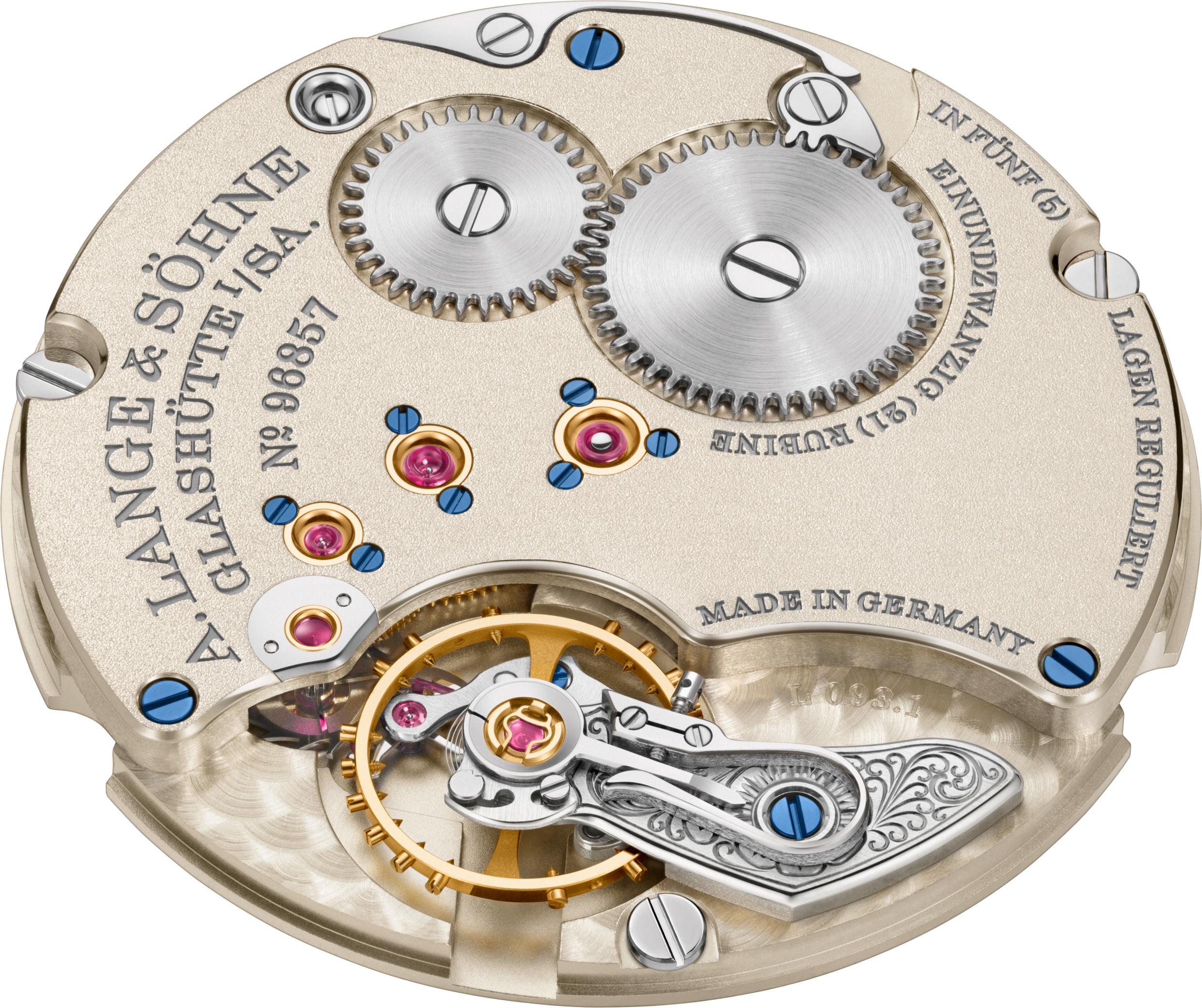 - Calibre: L093.1, ajustado en 5 posiciones; platina y puentes de German silver, grabados y decoraciones a mano exclusivos de la edición