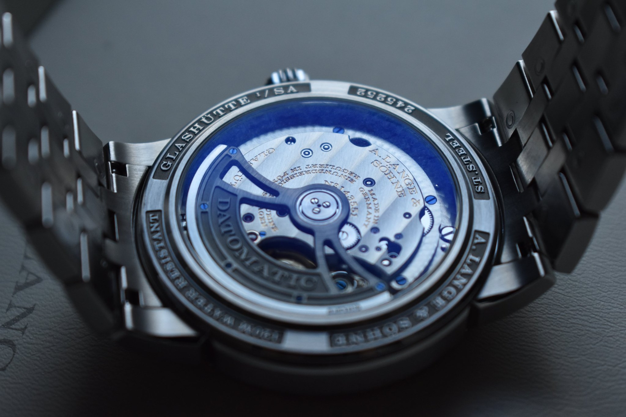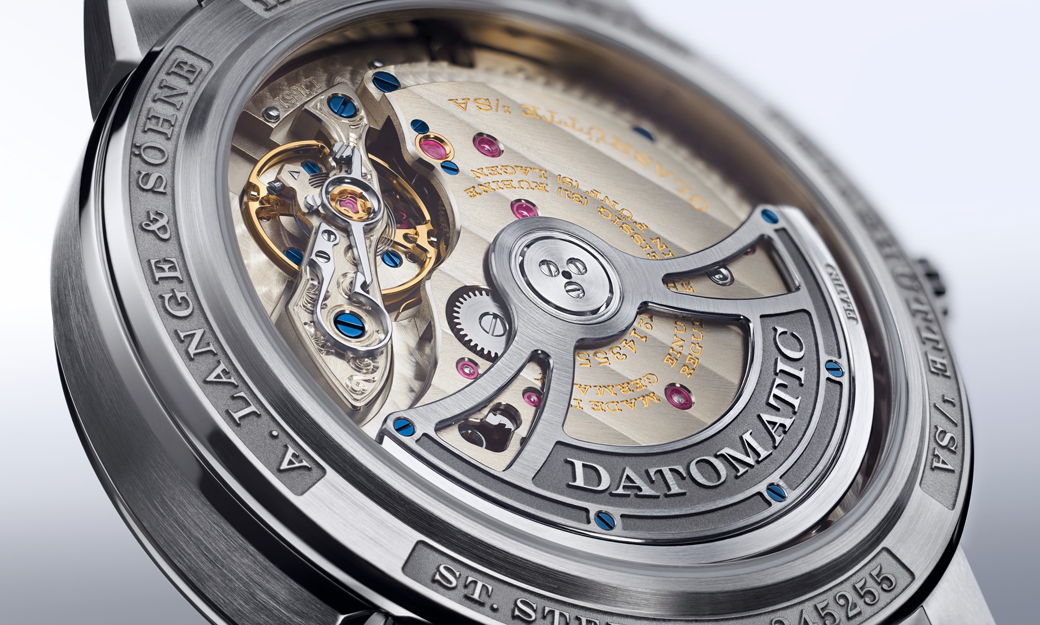 Mecanismo de tres cuartos platina, automático y visible al fondo del reloj hecho de cristal de zafiro. Se trata de un calibre de 32.9 mm dotado de gran fecha y día de la semana, que es armado por un rotor unidireccional esqueletado con masa oscilante de platino. Esto brinda hasta 50 horas de reserva de marcha a una nueva frecuencia para Lange: 4 Hz.