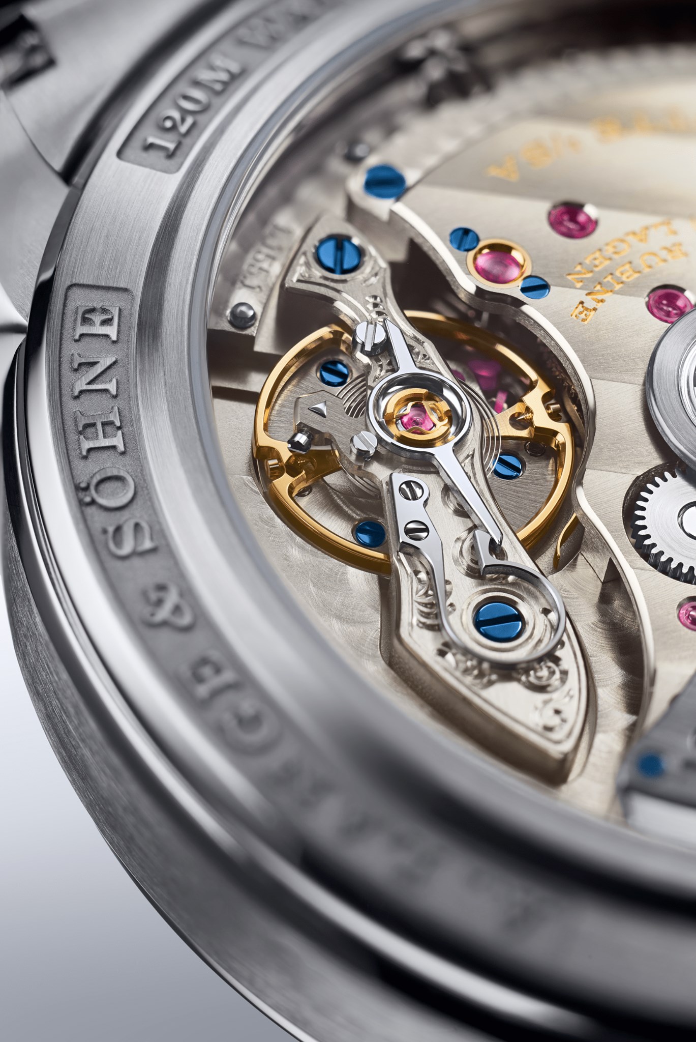 El sistema de oscilación se sostiene mediante un puente de rueda de volante asegurado en dos puntos, grabado a mano con motivo ondulado. Mientras que el resto de la decoración busca continuar la tradición de la marca ofreciendo un toque de modernidad. El calibre está acabado a mano y montado 2 veces, a fin de garantizar la fiabilidad total como sucede en todo A. Lange & Söhne.