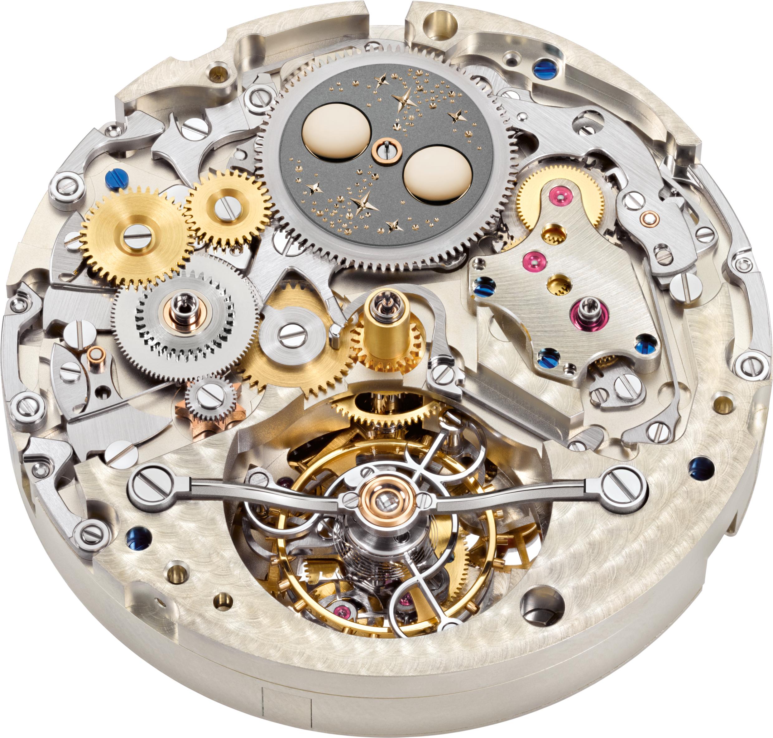 - Movimiento: mecánico de carga manual de cronógrafo rattrapante con calendario perpetuo y regulador tourbillon; transmisión huso cadena para marcha constante