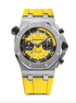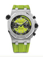 Audemars Piguet se quita la corbata y se pone el traje de buceo con el nuevo cronógrafo Royal Oak Offshore Diver, una pieza ideal para el verano, ya que combina un diseño sumamente atrevido con colores divertidos y detalles brillantes que contrastan a la perfección. Las agujas e índices horarios en oro banco ennegrecido forman la mancuerna perfecta con brillantes carátulas de color mandarina, lima, limón y azul.