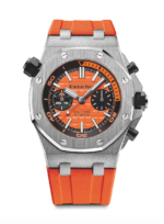 Dentro del dial se exhibe un motivo Grande Tapisserie, la versión oversized de la famosa Petite Tapisserie de la firma. Los contadores negros, índices aplicados y agujas Royal Oak en oro blanco ennegrecido con revestimiento luminiscente realzan la pieza de manera singular. El Royal Oak Offshore Diver se sujeta a la muñeca por medio de una correa de caucho en diferentes colores con hebilla de acero inoxidable.