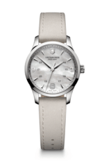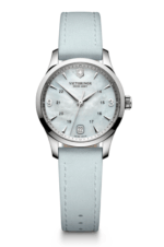 Su extensión de caja alcanza los 30 mm de diámetro, mientras que su lectura parte del centro entregando las informaciones de: horas, minutos y segundos, además de una graduación militar de 24 horas, típica de Victorinox. La carátula madreperla se entrega en colores pastel a juego con una correa de cuero, mientras que al interior late un corazón de cuarzo de fabricación suiza Ronda 705.