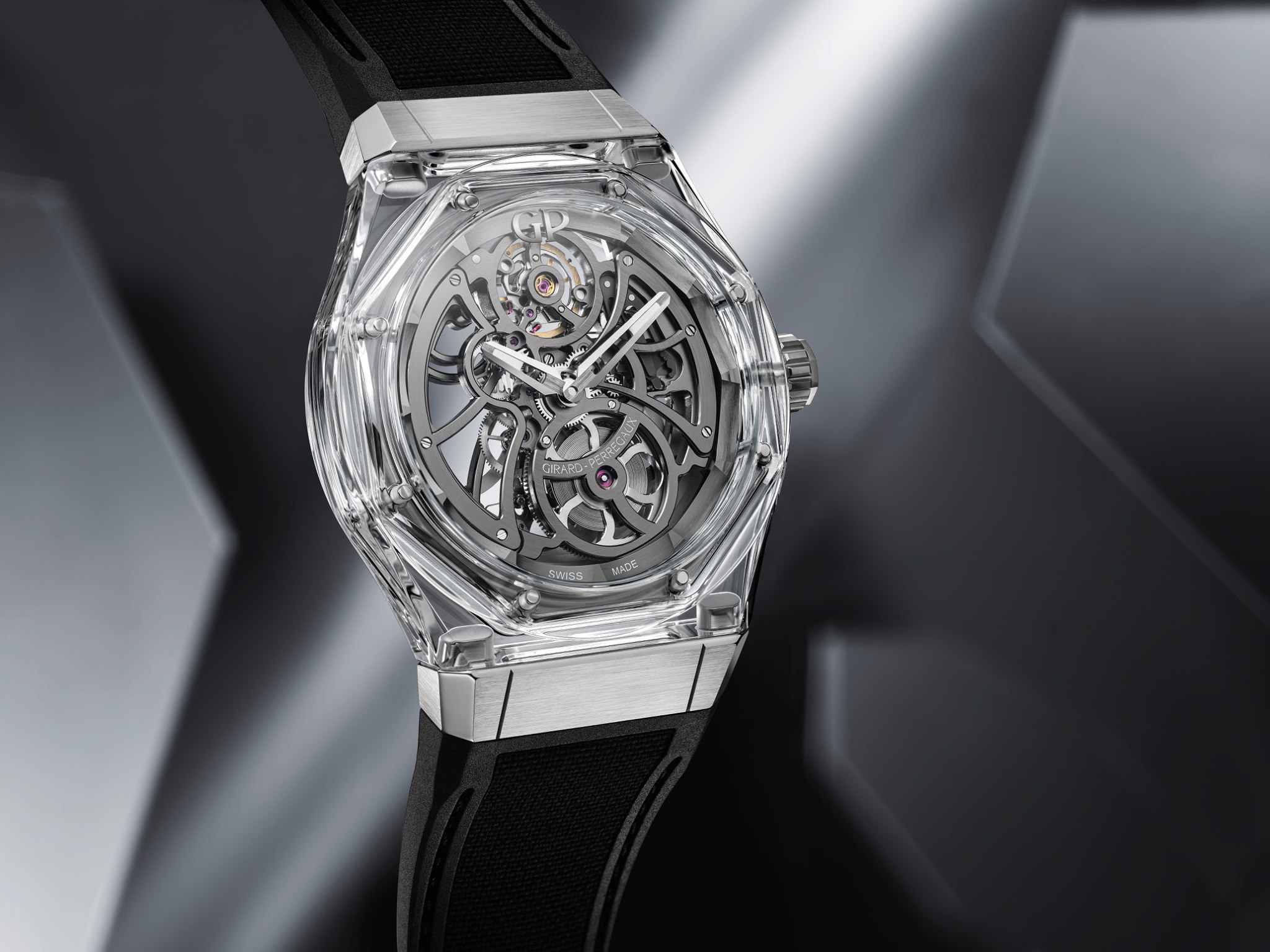 Absolute Light, su nombre pone en evidencia la fabricación de su caja desarrollada en cristal de zafiro y titanio, una transparencia que deja ver la belleza de la ingeniería del calibre GP01800. Un motor esqueletado de remonte automático con masa oscilante calada.