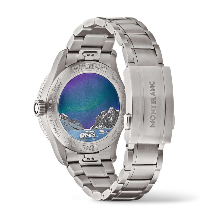 El grabado en 3D en el reverso de la caja plasma el hermoso paisaje del Polo Sur y nos recuerda este histórico momento. Junto con la carátula color azul hielo con efecto sfumato, la pieza entera evoca el sentimiento de ver una vista desde lo alto de una montaña. El reloj está disponible con un brazalete de titanio intercambiable así como una correa de textil gris que evoca a las cuerdas usadas en el montañismo.