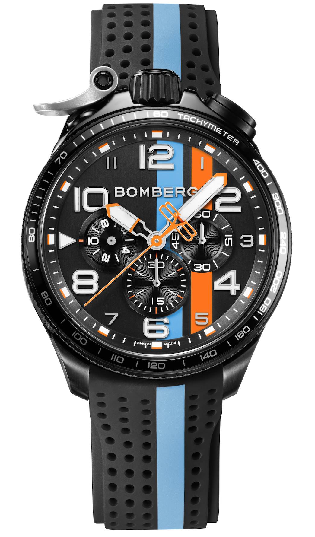 En talla XL, la caja se extiende hasta los 45 mm de diámetro y da sostén a un movimiento de cronógrafo de cuarzo Ronda 3540. Abrazado con pulsera de silicón perforado, se ofrecen cadena y medallón de acero como opción. Las ejecuciones lanzadas este Baselworld hacen un guiño a las racing stripes vistas en los patrocinios de Gulf, y a algunos bólidos que han competido en carreras de endurance.