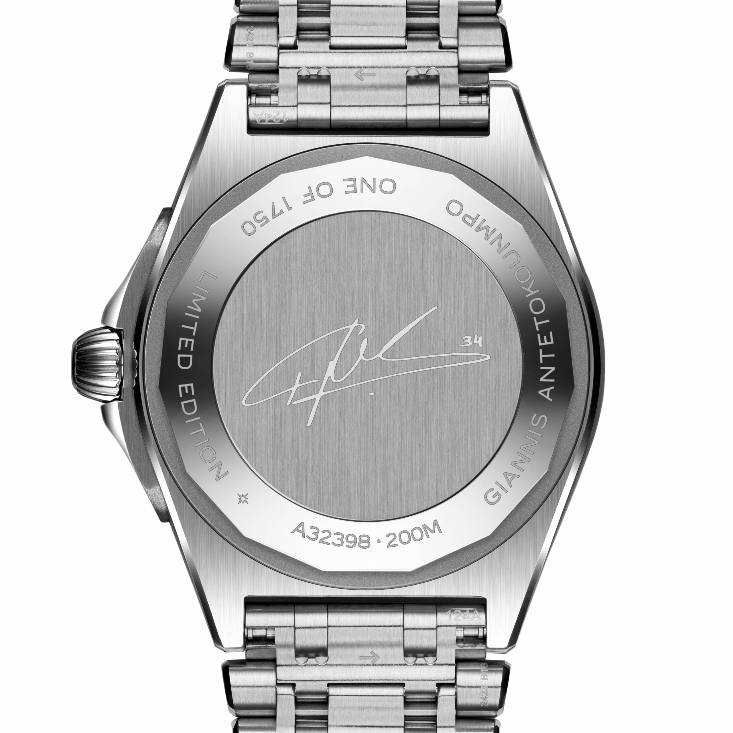 Como detalle especial a Giannis Antetokounmpo, la marca destinó una pieza única de Breitling Chronomat específicamente diseñado en conjunto con Giannis. Como gran entusiasta relojero, fue finalmente él quien seleccionó los detalles que cambian sobre las ediciones limitadas reservadas al público. Son tres las diferencias principales que notarás de esta edición.