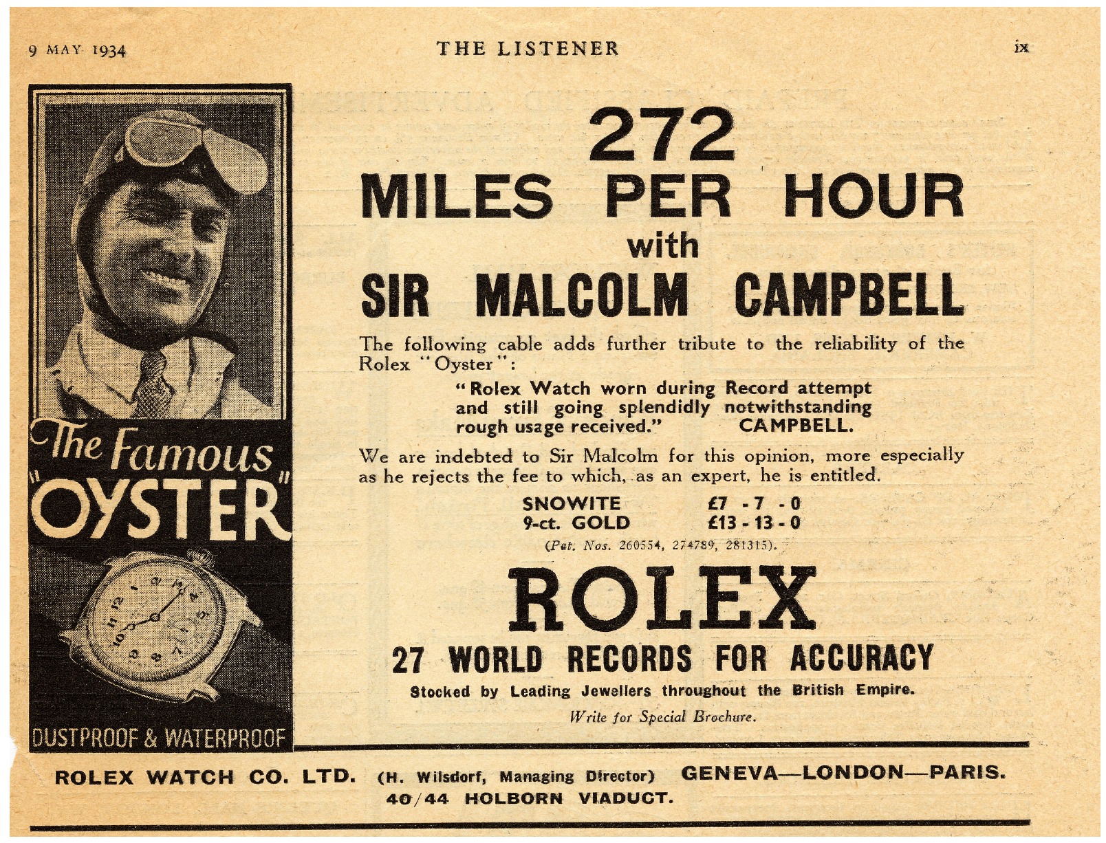 En 1933, cuando Sir Malcolm alcanzó una velocidad récord de 272 mph (438 km / h) en Daytona Beach al volante de su legendario automóvil Bluebird, lo hizo con un Oyster en la muñeca. Respaldando las capacidades del reloj después de probar su precisión y durabilidad, Sir Malcolm informó en un telegrama a Rolex: