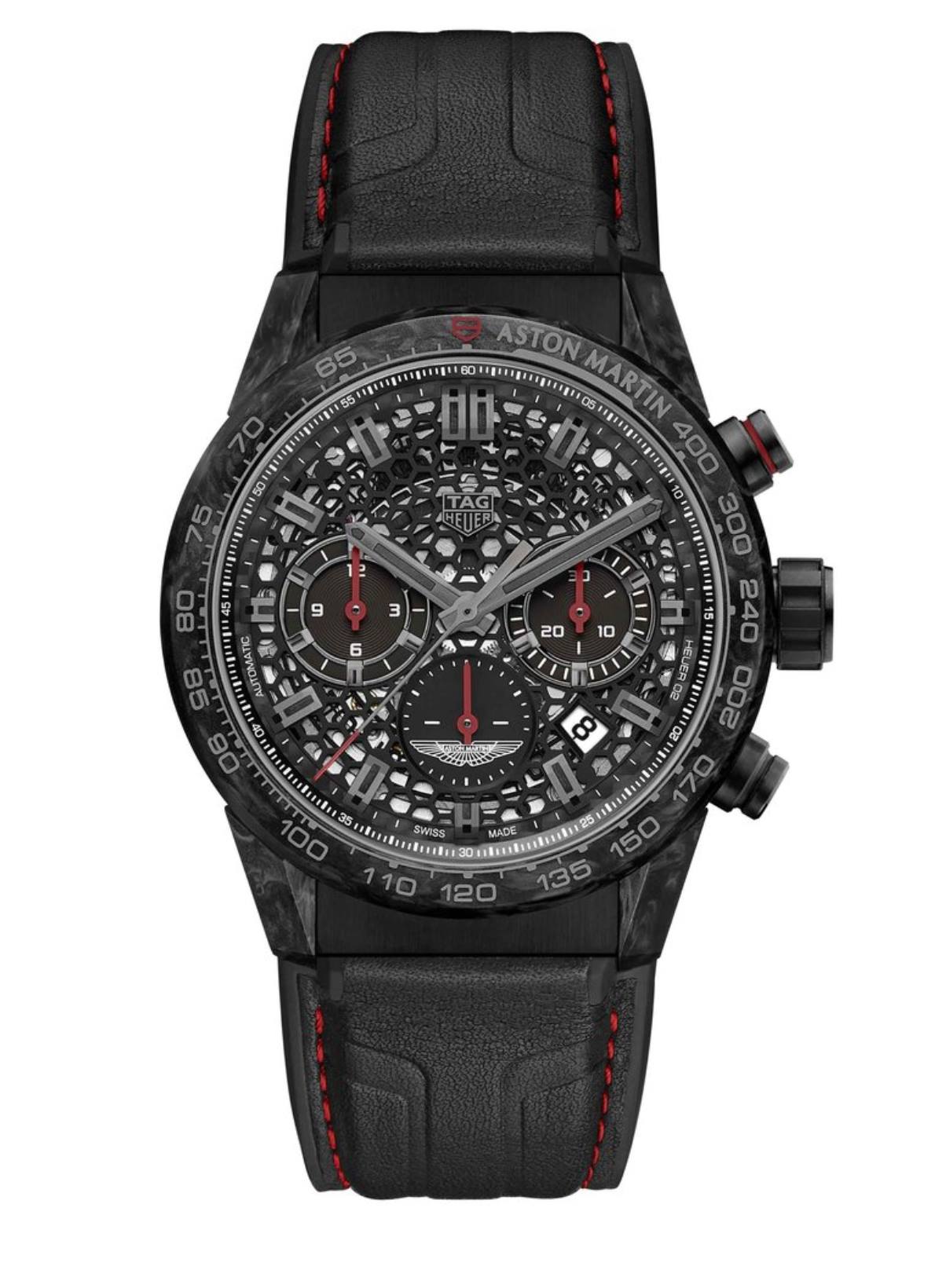 Cada auto viene acompañado, por supuesto, de un reloj de Edición Limitada al mismo número de ejemplares. Se trata de un cronógrafo DBS Edition Carrera Heuer 02 animado por el calibre mecánico automático Heuer 02 de manufactura.