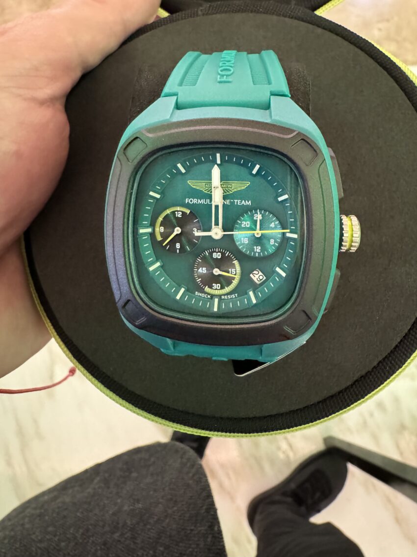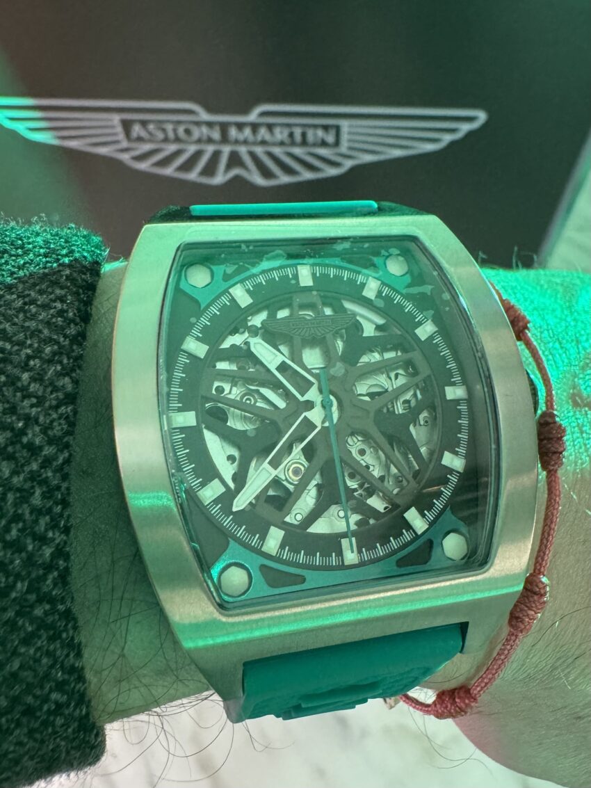El modelo estrella de la colección es el TRG Automático, una pieza con caja tonneau de titanio y esfera esqueletizada que cuenta con un movimiento automático japonés. Su diseño abierto rinde homenaje directo a las llantas de Aston Martin, mientras que la incorporación lateral de fibra de carbono y la correa subrayan su carácter técnico. Se presenta como la síntesis perfecta de ingeniería, ligereza y estética mecánica, convirtiéndose en una declaración de intenciones dentro del catálogo debutante