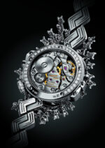El llamativo brazalete está compuesto por dos cintas tachonadas de diamantes que forman la clásica clave griega, reconocida a lo largo de la historia como símbolo de infinito y unidad. Las cintas se cruzan de forma simétrica desde la caja hasta la hebilla, y al llegar a la esfera rompen la simetría que predomina en el brazalete. Como las raíces de un árbol o la silueta de la Osa Mayor, cada hilera del brazalete se mueve independiente sobre la superficie del cristal de zafiro, decidido a mantener la preciosa esfera en su lugar.