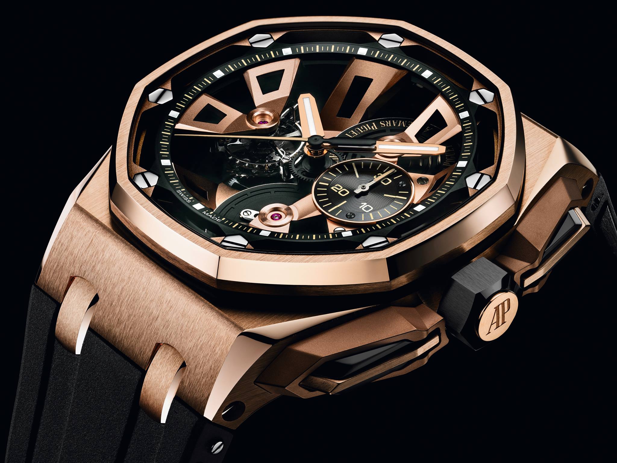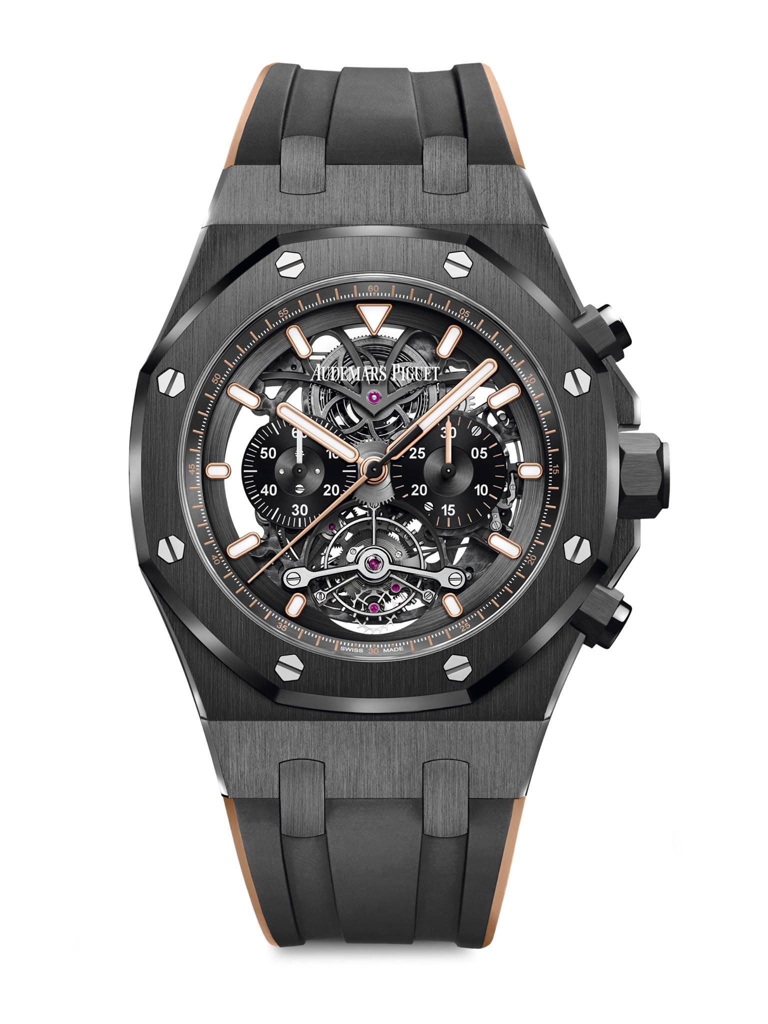 Royal Oak Offshore Tourbillon Chronograph luce dos nuevas ediciones limitas: acero inoxidable y oro rosa de 18 quilates, cada uno a 50 piezas. El calibre de remonte manual fue revisado, mientras que la caja goza de 45 mm de diámetro y se elimina el bisel exterior para cubrirlo con zafiro, logrando una profundidad excepcional.