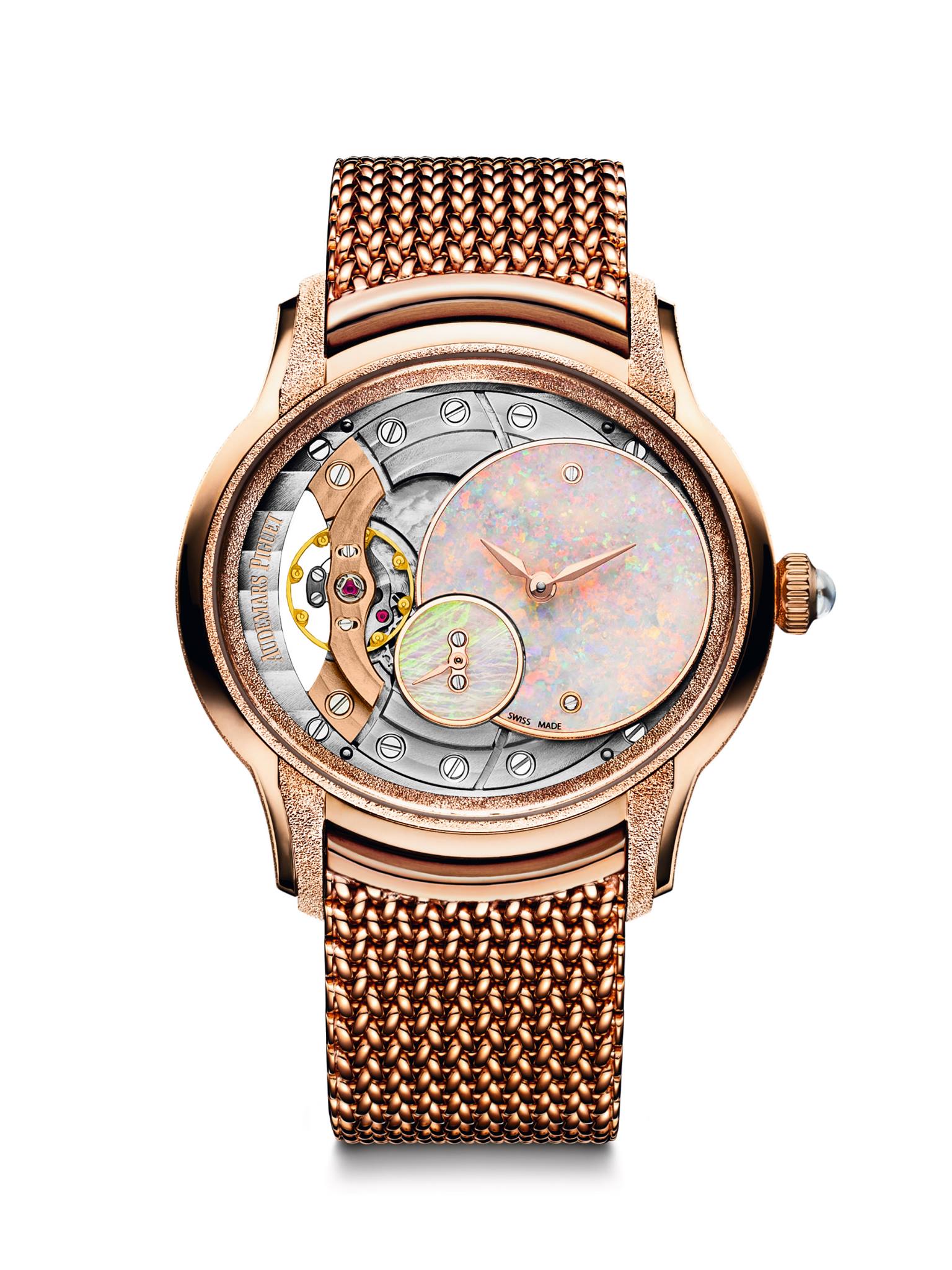 Millenary con carátula de ópalo, que es una piedra muy complicada de utilizar por su delicadeza, llena de vida al booth de la marca. Este mineral transforma la luz a fin de exhibir diferentes tonalidades de acuerdo al ángulo de visión. Asimismo luce una caja de oro rosa con acabado frosted gold y pulsera de malla de oro polaco.