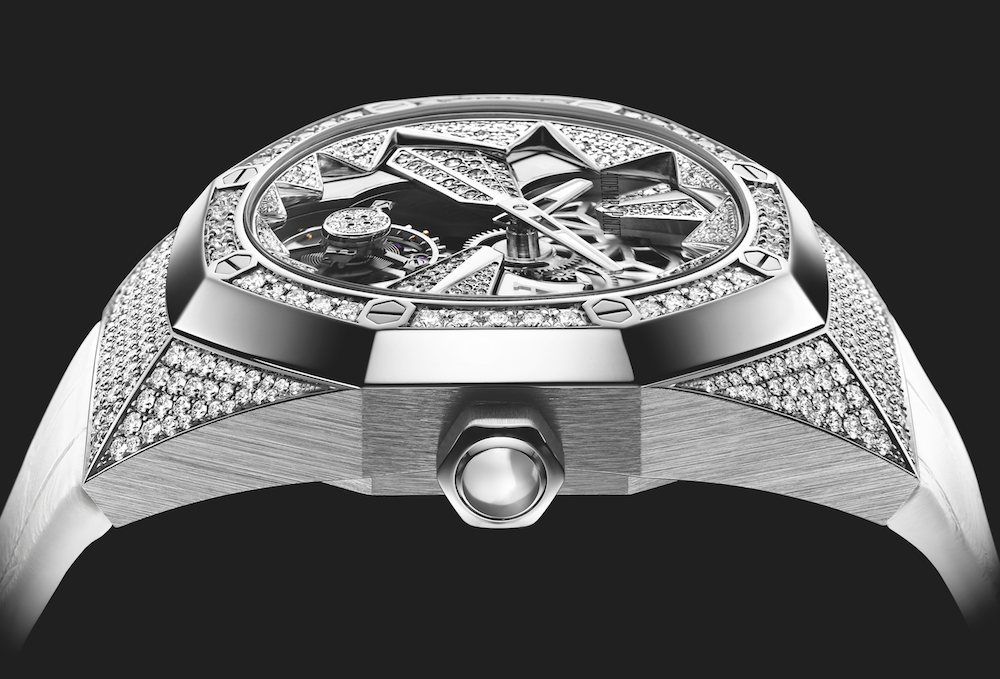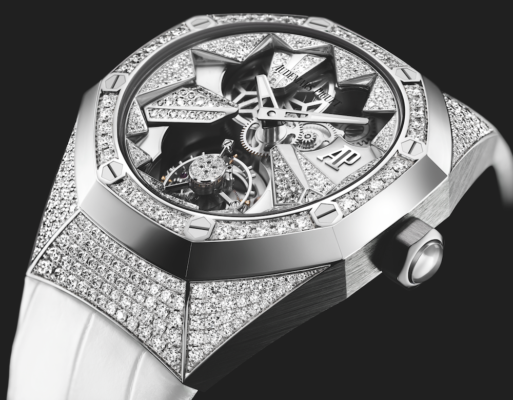 En su caja de oro blanco de 18 quilates con diamantes de talla baguette, yace un movimiento de manufactura de cuerda manual calibre 2951. Con una frecuencia de 3 hz y una reserva de marcha de 72 horas, el Royal Oak Concept Tourbillon Volante se ajustará a la muñeca femenina a través de una correa de piel de aligátor color blanco con escamas grandes cuadradas” y hebilla desplegable AP de oro blanco de 18quilates engastada con diamantes de talla baguette o por una correa suplementaria de caucho blanco.