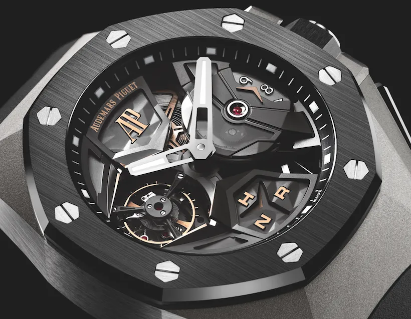 Esta nueva generación de Royal Oak Concept GMT se destaca por incluir un tourbillon volante por primera vez y nuevos movimientos con animaciones en la carátula.