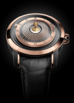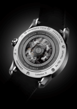 Las indicaciones de hora y minuto debieron sufrir modificaciones, ya que todo gira en torno al centro, se debió planear indicadores que sujetos por el centro rotarán a fin de indicar el tiempo, éstos están realizados en forma de cono, y construidos en microfibra de carbono, material ligero que facilita su movimiento y no consume mayor energía que el peso de las agujas, mientras que la eliminación de éstas posibilita enfocarse en la escultura. Ahora bien, hablamos de un mecanismo de remonte automático, por lo que el rotor debía presentar una masa oscilante acorde a la estética de la carátula. Para ello, “CC” echó mano del genio de Vianney Halter, un habilísimo relojero experto en soluciones mecánicas y de zafiros, creador de la masa oscilante de zafiro adornada con 5 carrillos de cilindro metalizado de alta definición, que además podrán competir entre ellos y propiciar un juego con los amigos, resultando ganador aquel que se sitúe más cerca de la “A” de Aurelio. . Finalmente el movimiento AV15 de carga automática no resulta mayor compromiso para un personaje como Claret, quien ha decidido ubicar la pieza en el rango de los 49 – 53,000 francos suizos dependiendo la versión de su elección: 68 piezas en oro rojo y 38 en oro blanco y titanio.