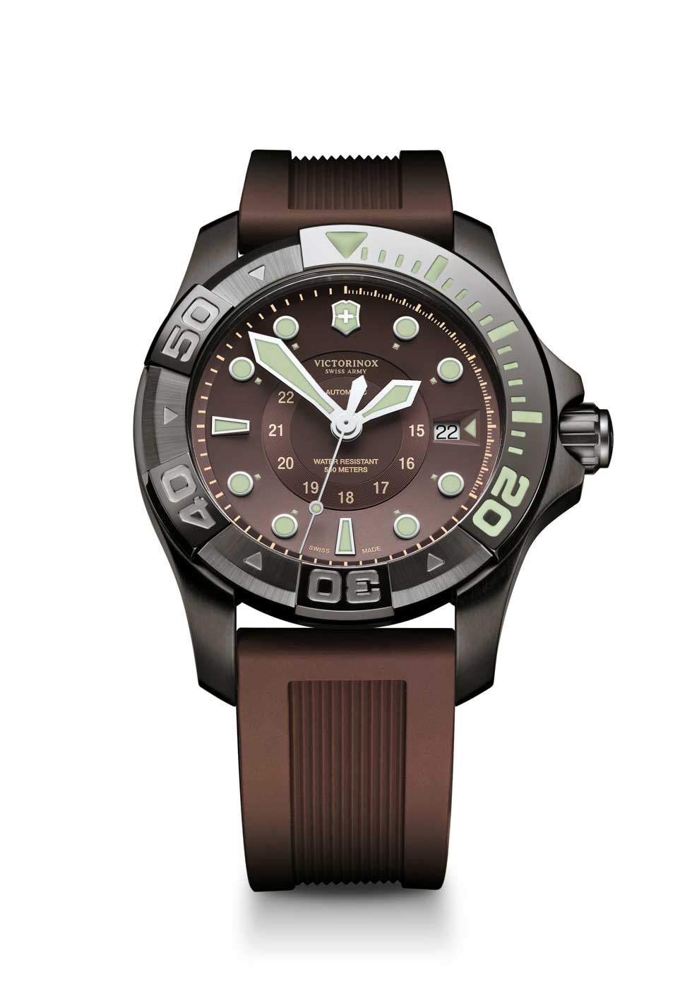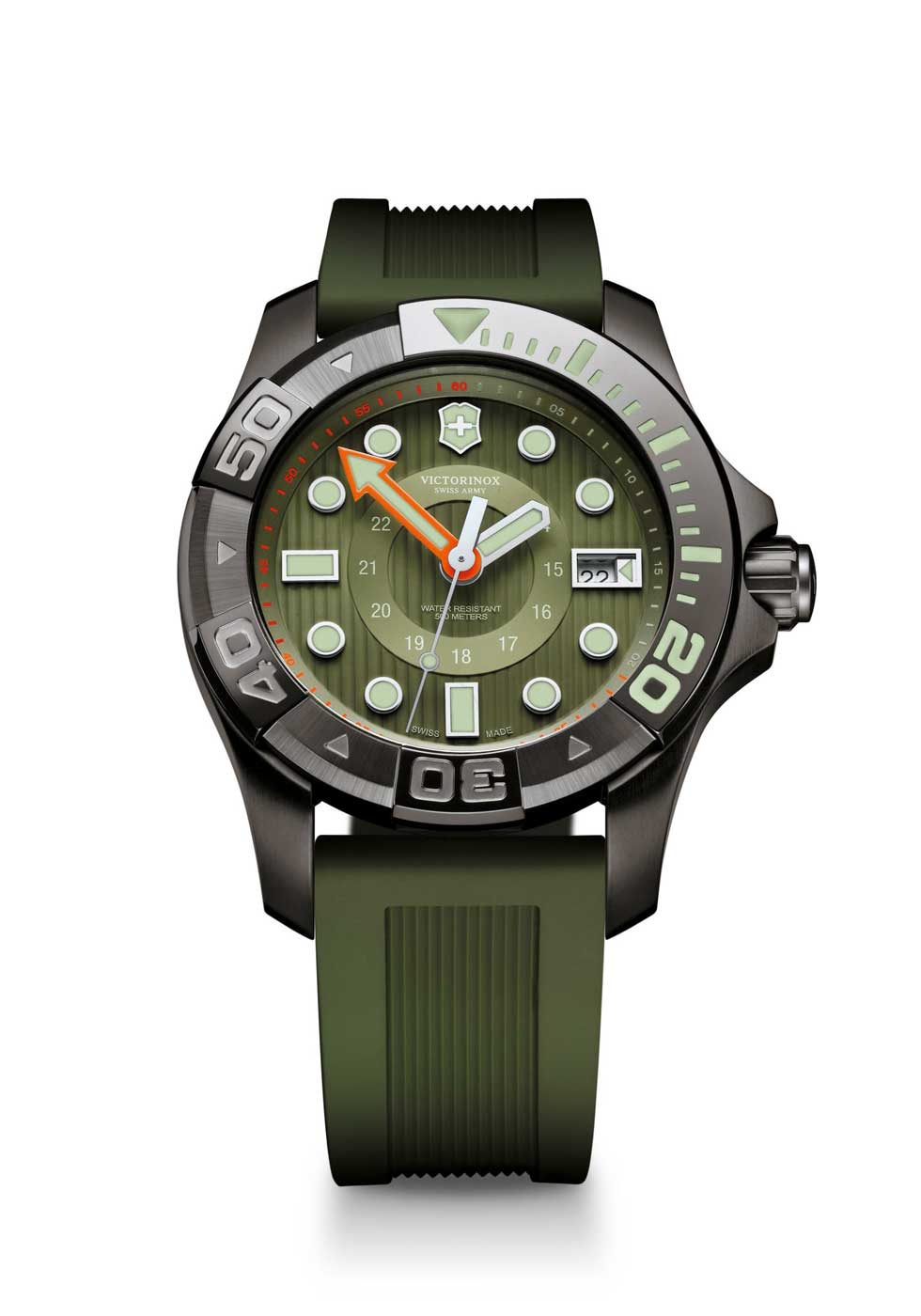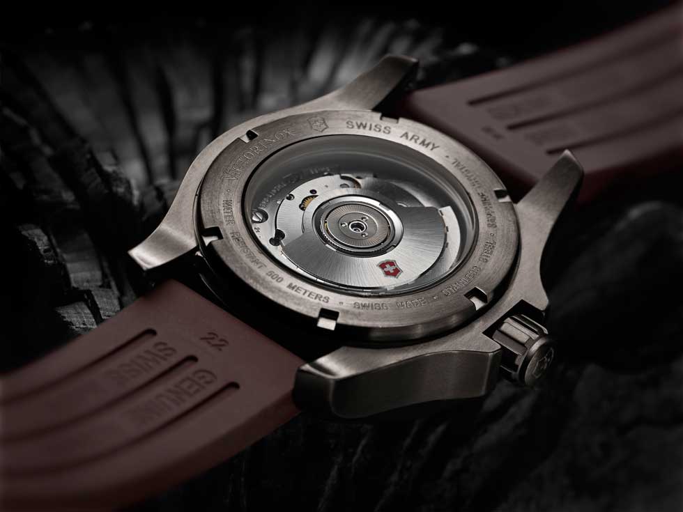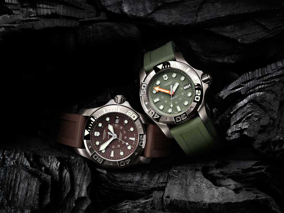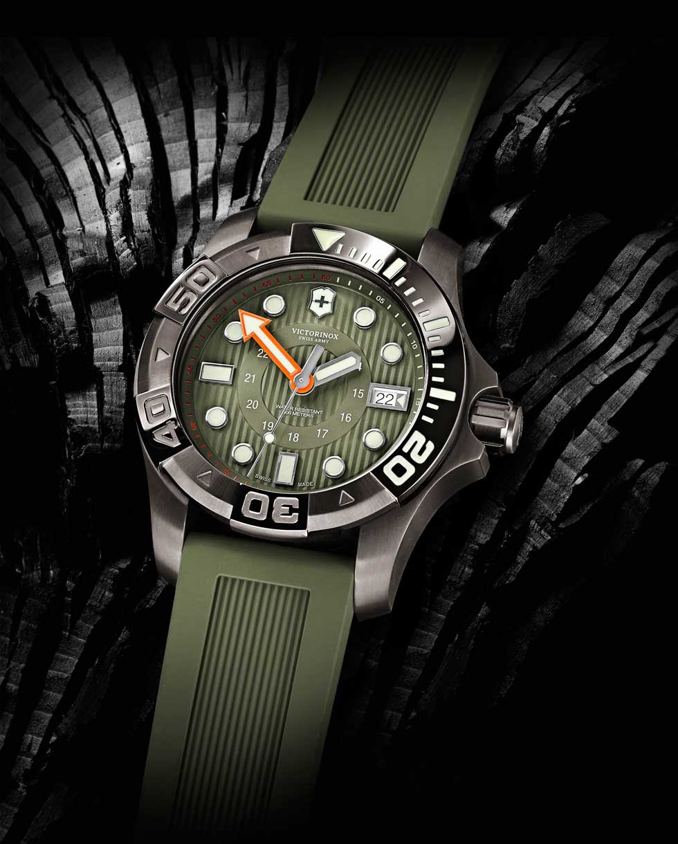 Dicho lanzamiento cuenta con los atributos primordiales de un instrumento de buceo: resistencia a los golpes, hermeticidad extraordinaria (500 m) y excelente visibilidad -debido a sus índices luminiscentes- a profundidades extremas. Sus colores suaves y orgánicos: negro, granate, marrón, gris, verde caqui y blanco, se inspiran en la naturaleza, mientras el revestimiento “Black Ice” o PVD dorado -presente en la caja, cuernos y bisel- aumenta el número de cualidades innovadoras de Victorinox. La idea de la carátula despejada incorpora un círculo liso y centrado, que incluye la hora militar (24 h). Las marcas de 20, 30, 40 y 50 minutos situadas en el bisel unidireccional, resaltan gracias al tamaño de sus números arábigos. De igual manera, la manecilla de los minutos -en forma de flecha- destaca en color naranja debido a su importancia para medir la autonomía de inmersión del buceador.
