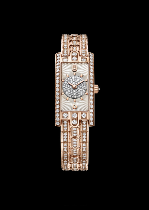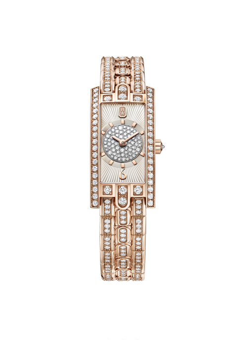 Igualmente deslumbra una versión más pequeña del icónico Avenue C, se trata del Avenue C Mini Art Déco, una pieza que concentra el potente brillo de los diamantes en un modelo de proporciones delicadas, concebido para resaltar las ataduras más finas. Avenue C Mini Art Déco es el digno heredero de las joyas Harry Winston, que viven muy cerca de la piel y se enlazan a las muñecas femeninas. El brazalete de oro rosa de 18 quilates ágilmente articulado despliega un fasto de 212 diamantes talla brillante. Los dos arcos a las 12 y a las 6 h están engastados con piedras imponentes y bien visibles, que contribuyen a la potencia de la pieza. Contemporáneas, la composición y la ornamentación de la esfera rompen la rigurosa escenografía del reloj. Un guilloché soleado juega alegremente alternando el mate y el brillante, mientras el contorno de las horas azuleado alberga en su centro un engaste nieve que cubre la esfera con un aura centelleante.