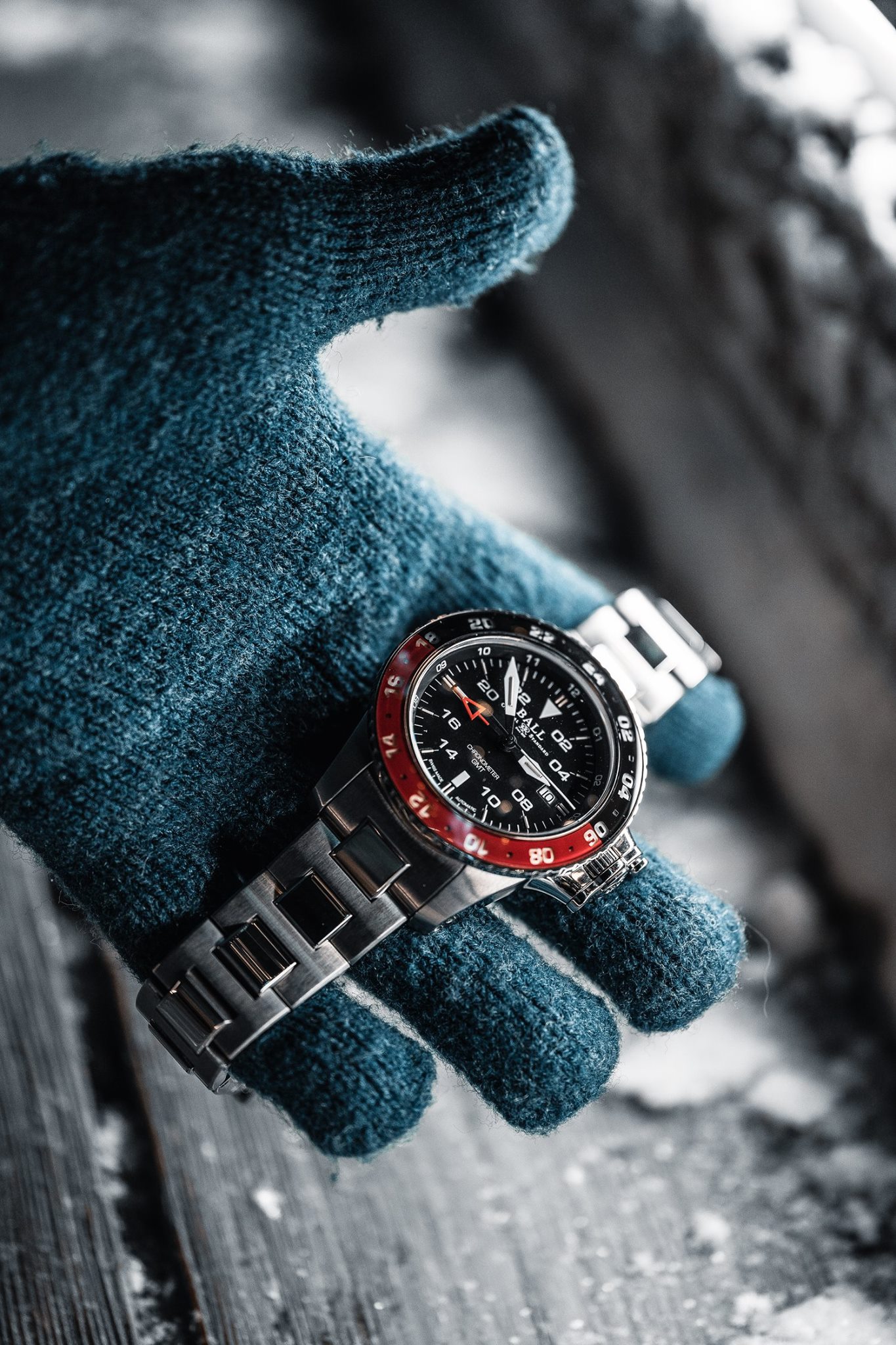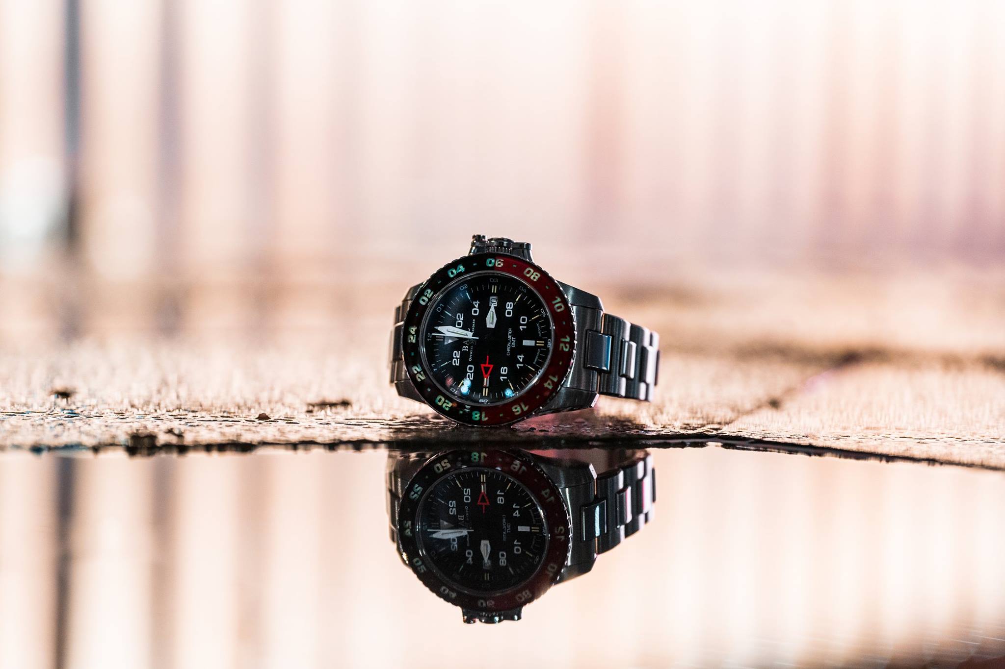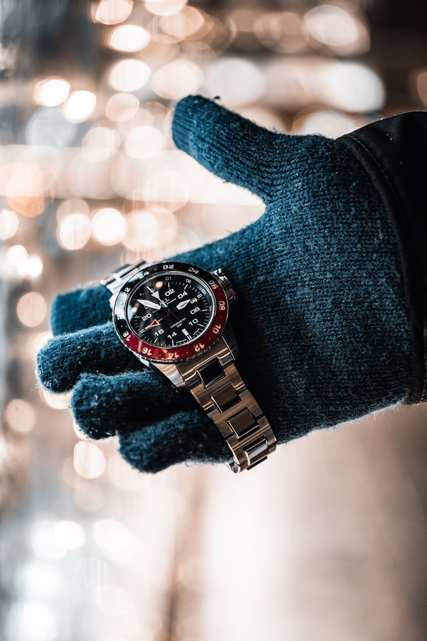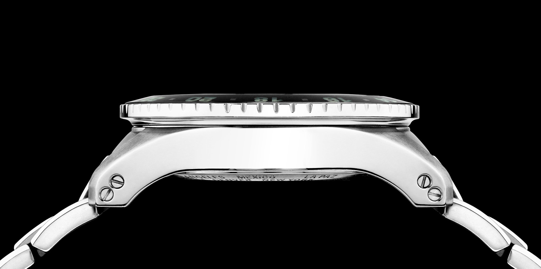 Mientras que su bisel está desarrollado en aluminio bicolor y recubierto con cristal de zafiro a fin de protegerle contra los arañazos y dar paso a una colocación de cápsulas de gas tritio que se verán favorecidas cuando las condiciones de luz sean pobres o nulas. La carátula luce un color azul océano, pero se puede optar por un dial color negro.