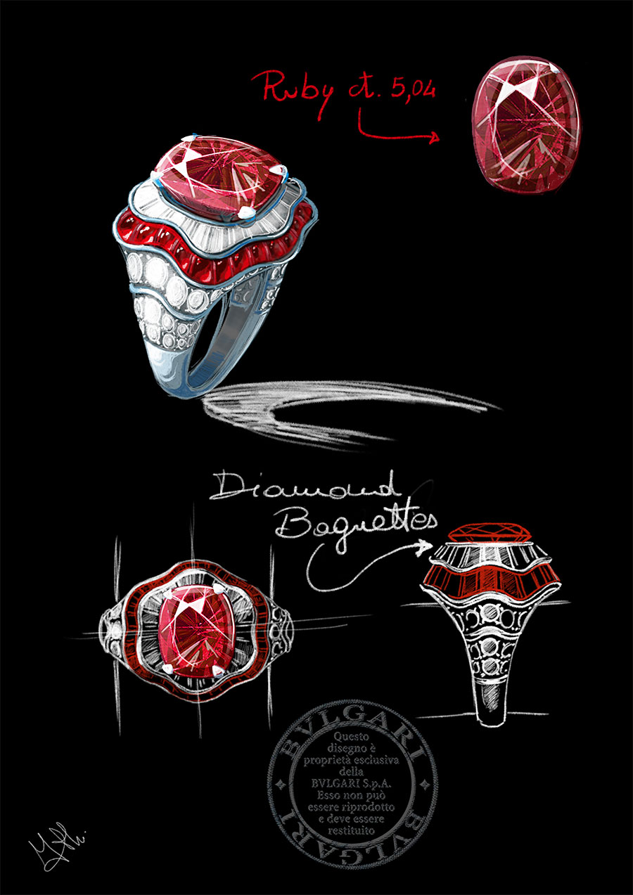 Capturando la suavidad y la voluptuosidad inyectadas por los artistas barrocos, incluido Gian Lorenzo Bernini, en sus esculturas, los aretes y anillos “Ruby Drapery” juegan con oro blanco, diamantes y rubíes para dibujar líneas curvas y sinuosas inspiradas en cortinas de mármol.