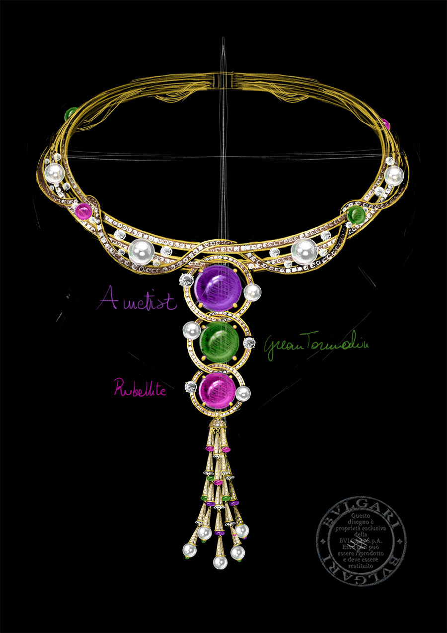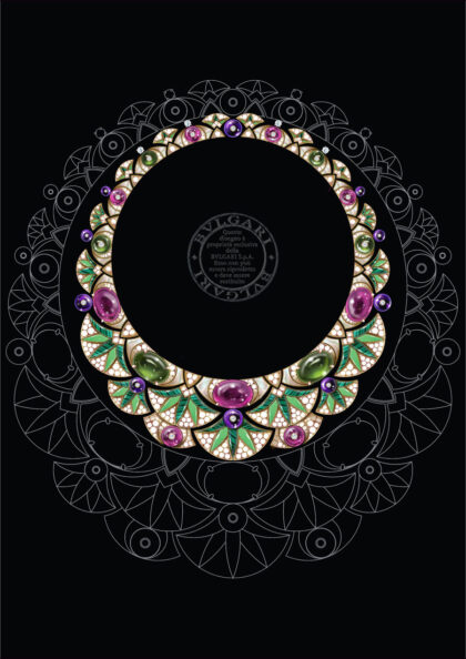 Por su parte, el collar “Lady Arabesque”, es un verdadero homenaje a la estética barroca combinada con una paleta de colores Bvlgari por excelencia, tonos púrpura, verde y oro. Los zafiros rosados y violetas de Sri Lanka se combinan con pequeñas turmalinas Paraiba, esmeraldas, así como diamantes redondos y sueltos, para una alegre extravagancia de rizos barrocos. Los pendientes coordinados son un ejercicio de gracia femenina y elegante.