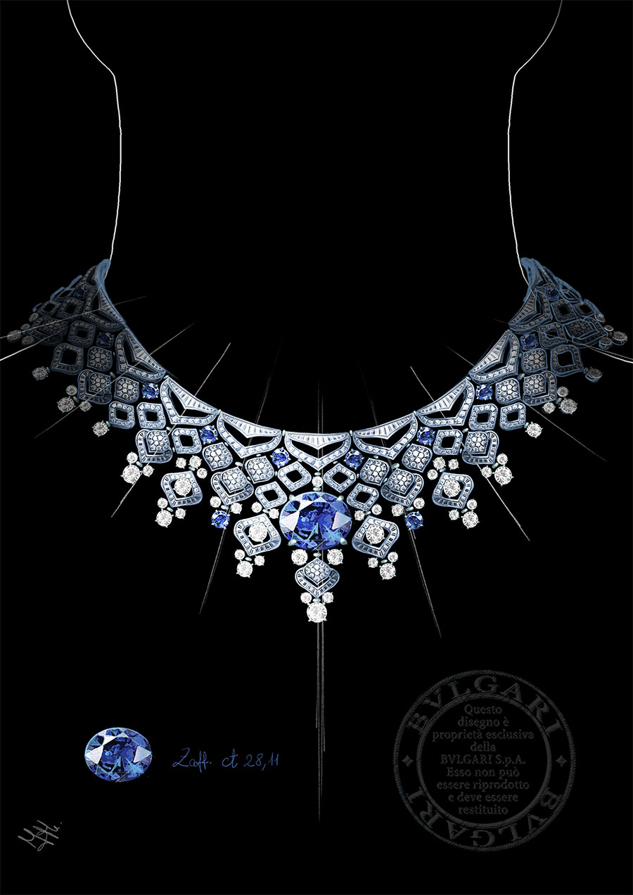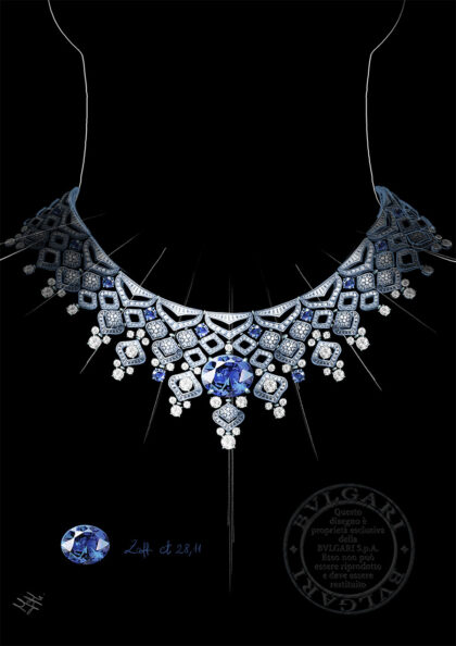 Por parte, el collar “Sapphire Lace” combina platino, diamantes y zafiros azules de Ceilán para crear una textura ligera y femenina, inspirada en las exquisitas telas de encaje barroco.