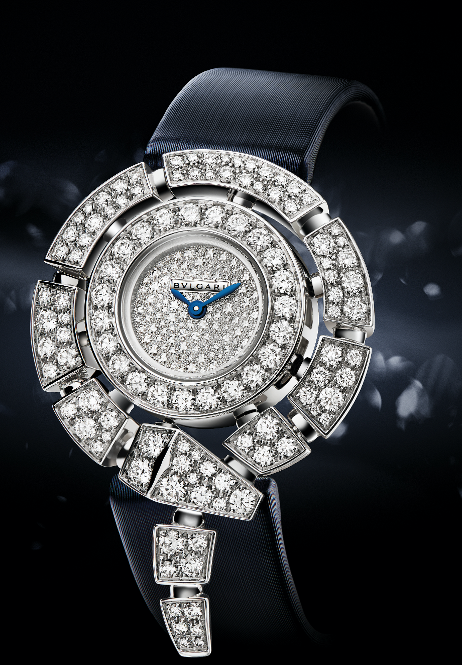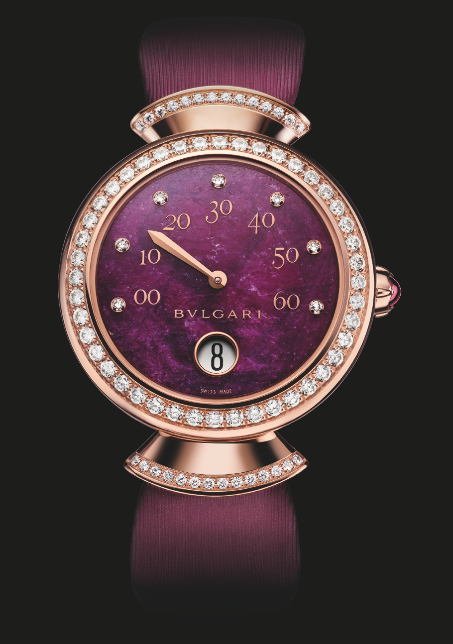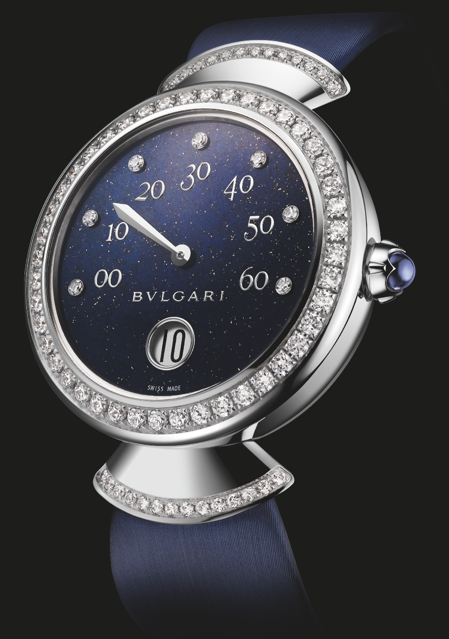 Divas Dream. Horas saltantes y minutos retrógrados son integrados a esta colección que recupera la época de la Dolce Vita, y se propone como un tributo a la mujer que desea algo más que un movimiento potenciado por una batería: calibre BVL 262. Asimismo, su carátula no ofrece complicación a la lectura, pero no pierde un ápice de sensualidad y romanticismo. Construido en caja de oro blanco de 37 mm de diámetro, cuenta con 72 diamantes engastados a la construcción de la pieza..