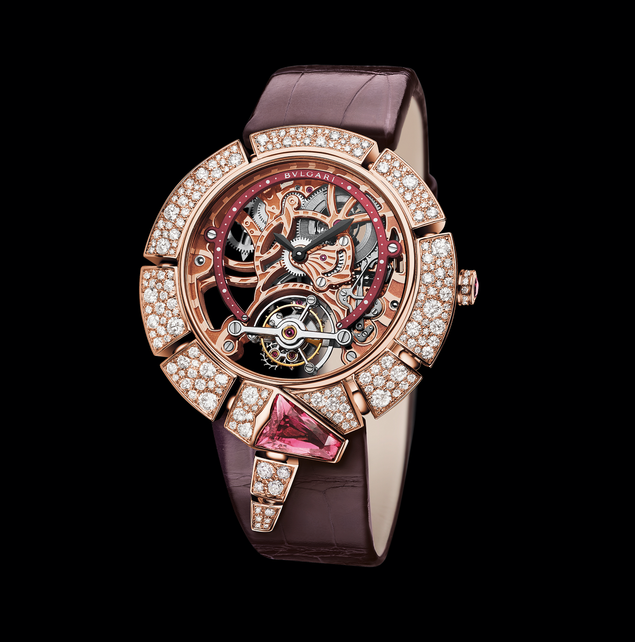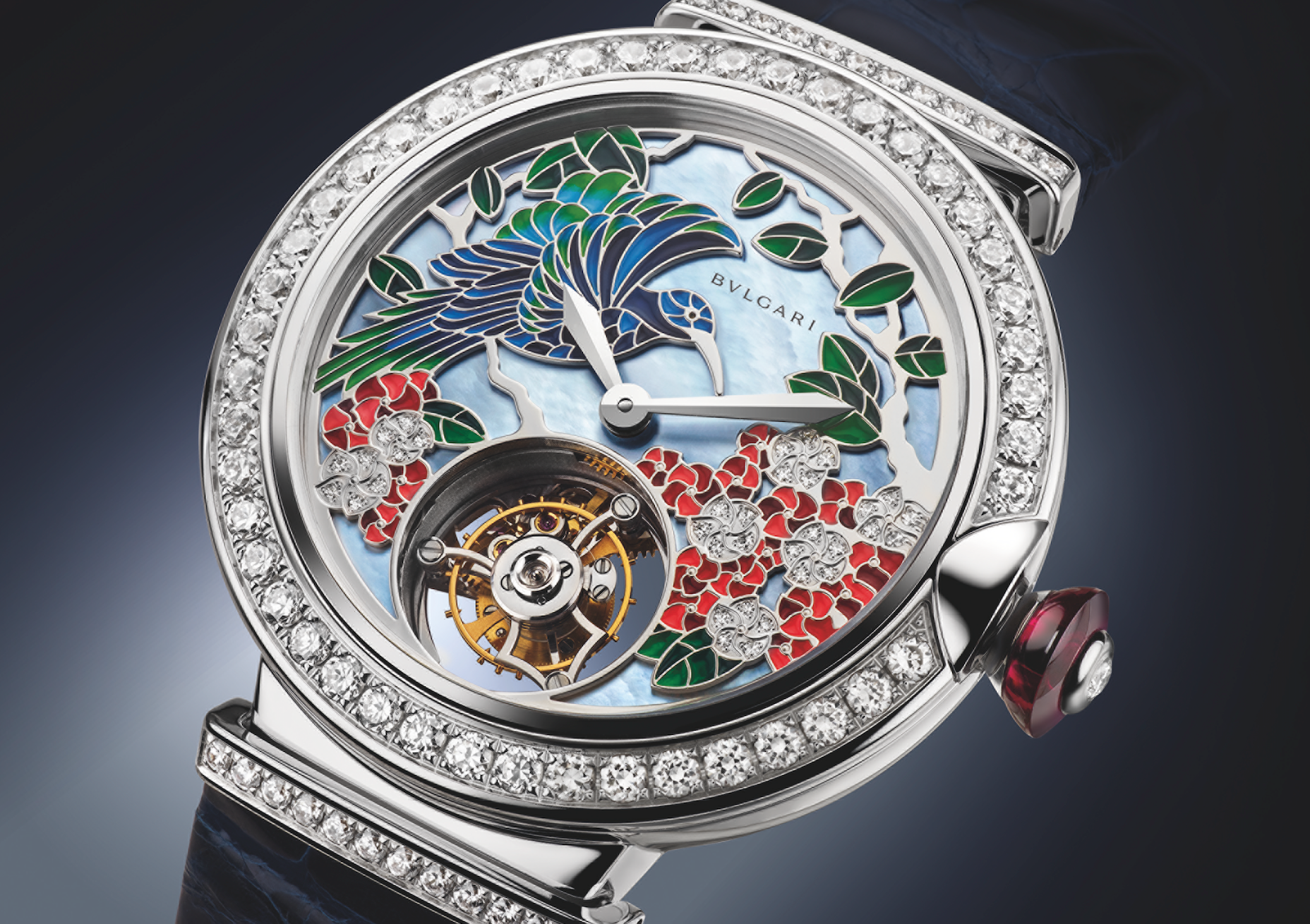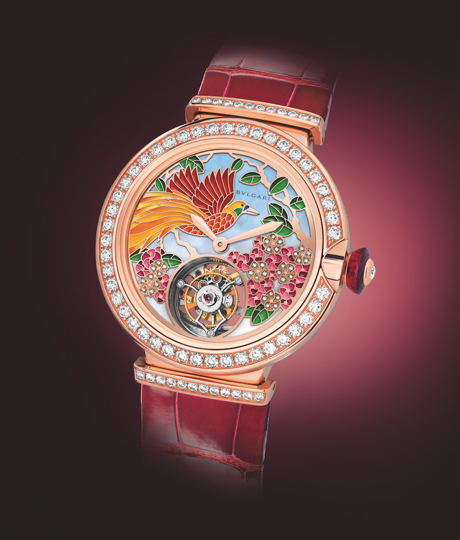 Il Giardino Paradiso. Dos relojes preciosos adornados con carátulas llenas del esplendor de la flora; un ave exótica que cobra vida gracias al colorido de su lienzo artesanal hecho de madreperla azul en representación del cielo, que goza de la pintura miniatura y los diamantes engastados a su caja. Al interior late el calibre BVL 263 con tourbillon para la indicación de las horas y minutos, mientras que –de acuerdo a su configuración, se abrazarán a la muñeca mediante pulseras de piel de cocodrilo azul o rojo.