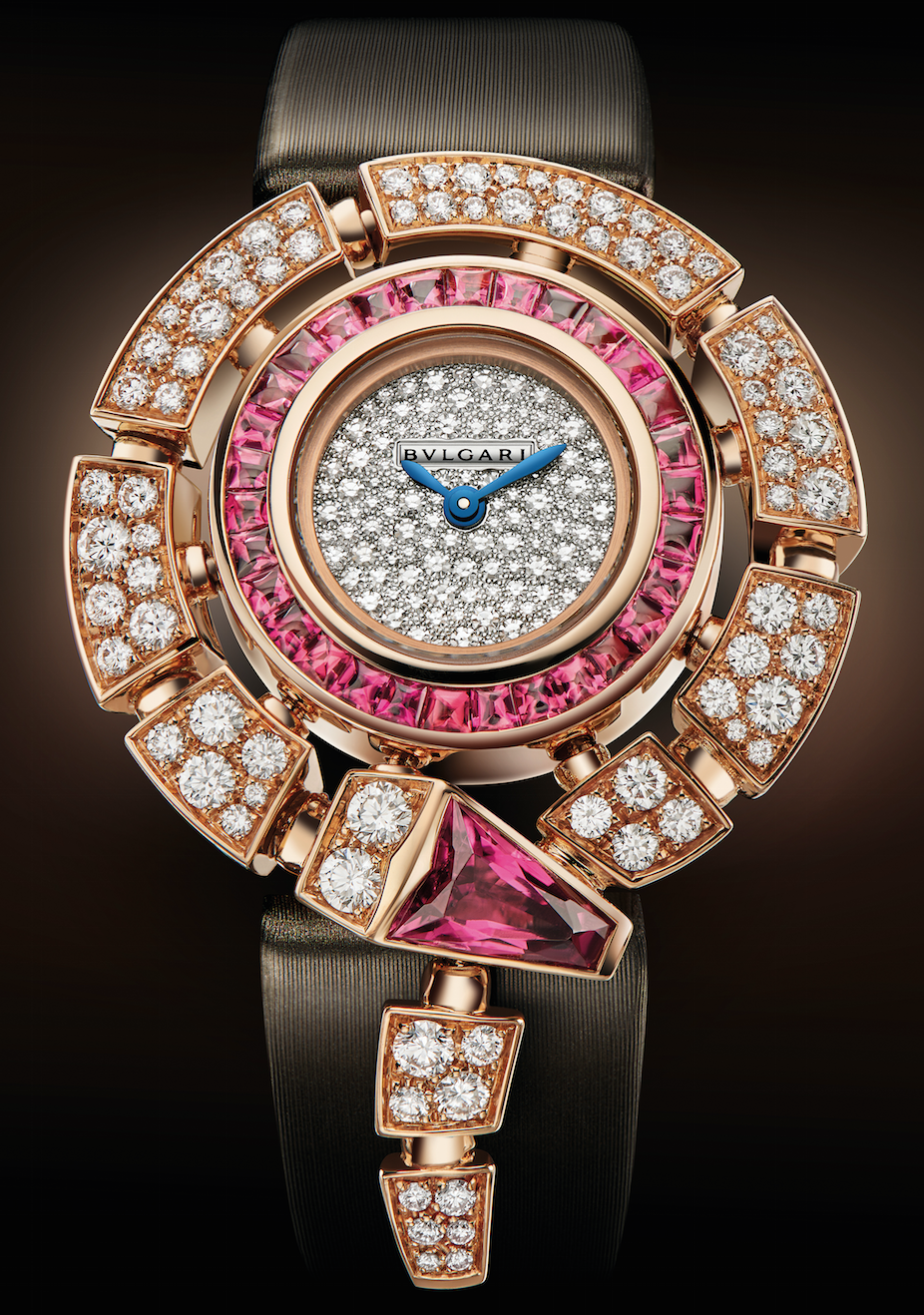 Incantati. Desarrollado a partir de un núcleo de caja adornada con una carátula llena de diamantes, las horas y minutos de esta pieza animada por un mecanismo de cuarzo son estranguladas gracias a la belleza del trabajo de Alta Joyería de la Casa con origen romano. Oro rosa, diamantes, zafiros. La obra maestra sitúa un calibre esqueletado con tourbillon, disponibles en oro rosa o blanco de 18 quilates.