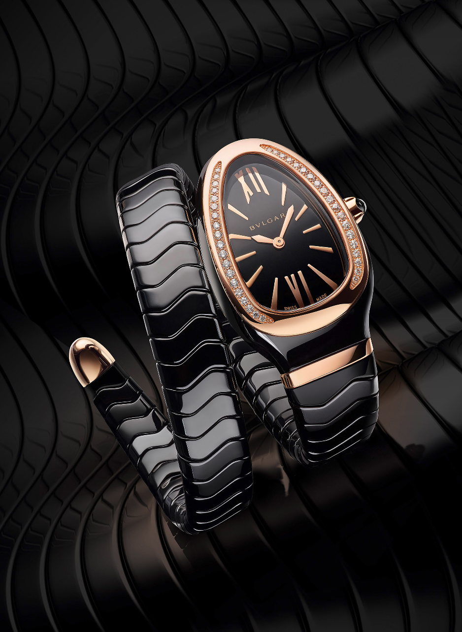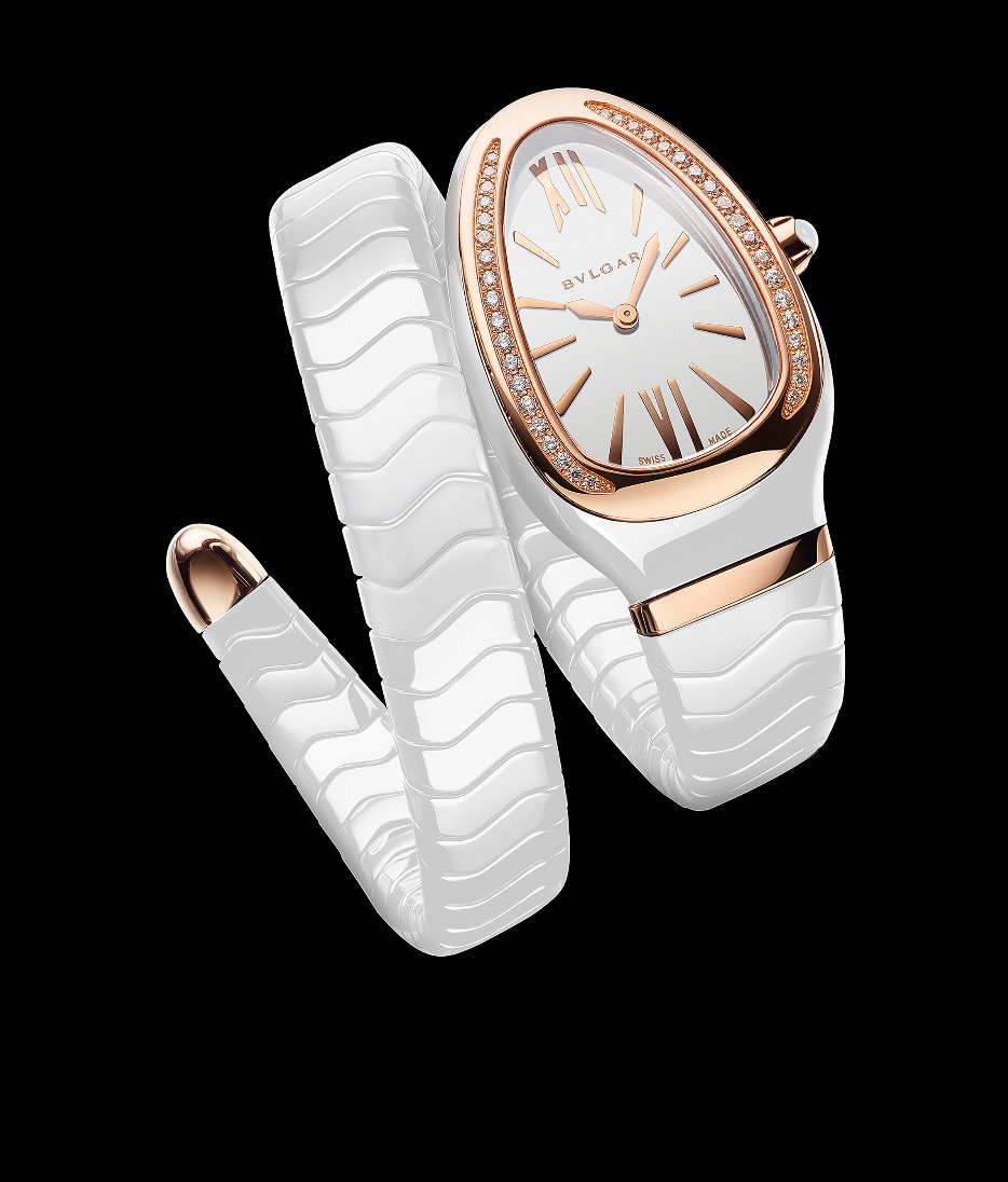 Spiga. Encarna un reto técnico, ya que hacer un brazalete flexible y articulado tipo Tubogas en cerámica representa una nueva forma de destreza de la Maison con sede en Roma, conocida por su excelencia en el trabajo con los materiales y la presentación de innovaciones capaz de reinventarse. Volcada a los códigos de estilo de Alta Relojería para infundir con un toque moderno, fresco y sensual. Este nuevo reloj emana de inmediato una sensación de glamour gracias al tacto suave de la cerámica en la piel.