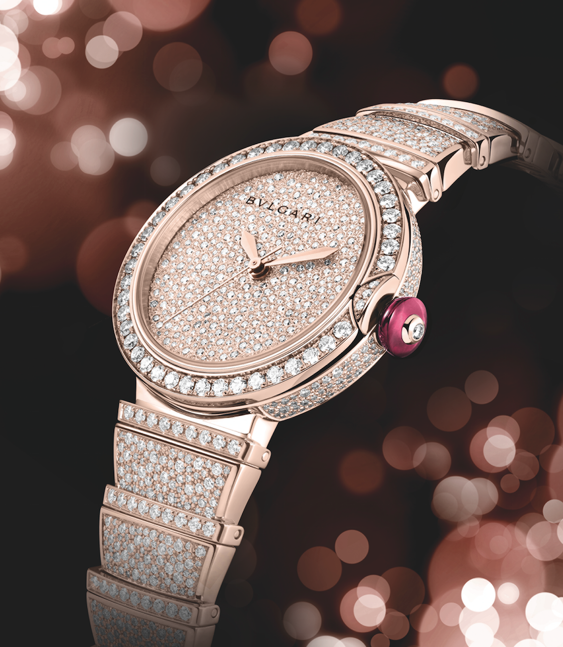 Lvcea High Jewellery. El engaste de los diamantes refleja su luz en esta pieza de oro rosa animada por el calibre B77, son 1,879 piedras destinadas a deslumbrar sobre la geometría de la referencia. Las horas, minutos y segundos parten desde el centro, mientras que la pieza se abraza gracias al emblemático brazalete del modelo.