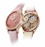 - L.U.C XP 35mm Esprit de Fleurier Peony es el modelo femenino de la serie L.U.C., en su versión 2016 una peonía despliega sus delicadas curvas sobre la esfera en nácar de Tahití, donde aparece majestuosa, en oro y diamantes engastados sobre la base de la esfera de oro rosa.