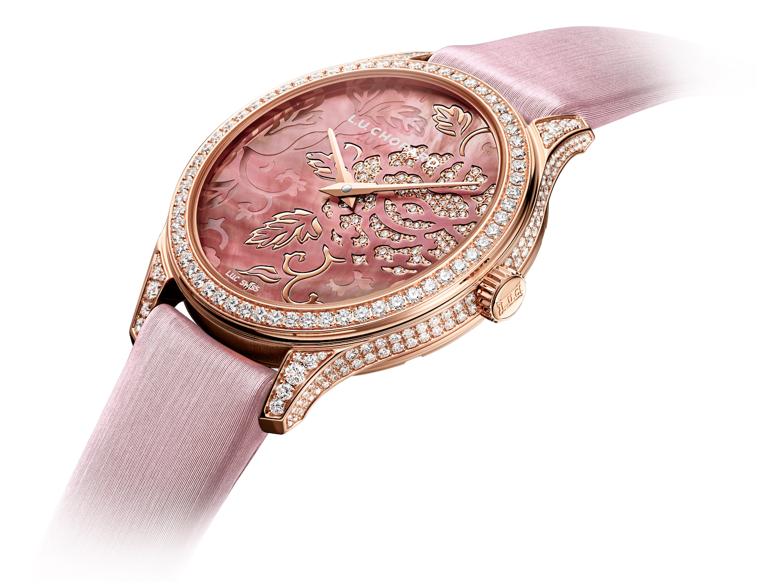 Inspirada en una flor del oriente. Originaria de Asia central, la peonía se cultivaba principalmente como planta medicinal y se utilizaba como remedio para diversas afecciones. Al principio era un símbolo de buena salud y poco a poco se le fueron adjudicando virtudes cada vez más numerosas, pasando a convertirse posteriormente en portadora de buena fortuna, de prosperidad y de matrimonio feliz. En Asia es símbolo de riqueza y de honor. Finalmente, la caja está desarrollada en oro rosa de 18 quilates, mientras que la carátula es de oro, y está recubierta de nácar de Tahití.