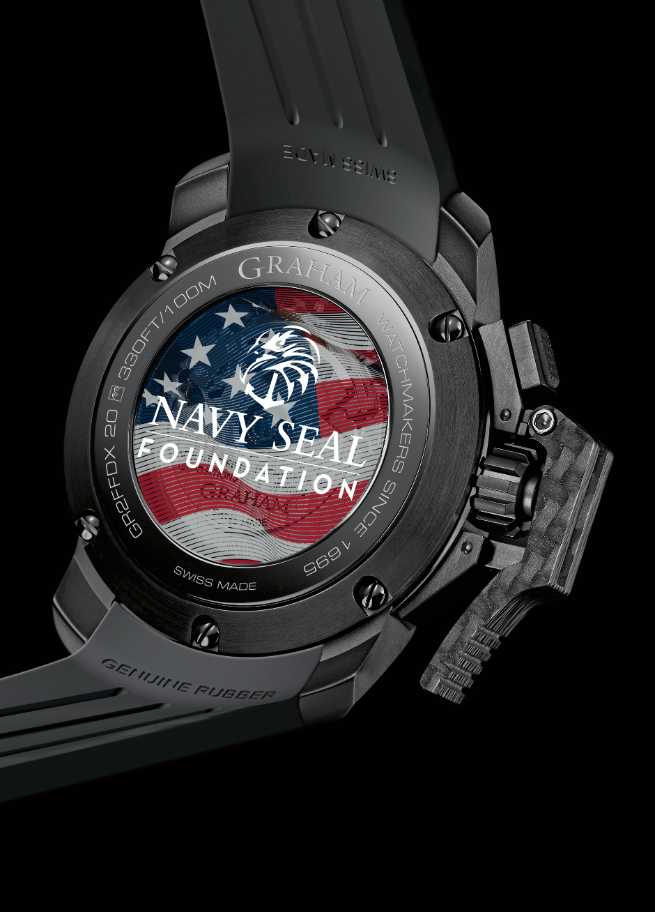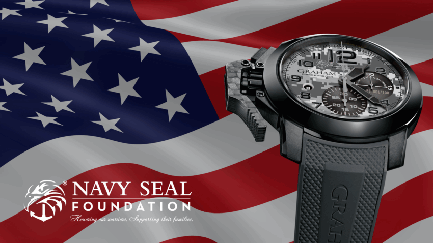 Su caja de acero –de 47 mm– extiende su admiración y respeto por las fuerzas especiales de los Estados Unidos conocidas como Navy SEAL´s, creadas por el Presidente J.F.K., en la década de los 60, con la finalidad de dominar cualquier ambiente: Sea-Air-Land). Su patrón de camuflaje añade un toque de distinción bélica a la pieza, mientras que en el reverso destaca la bandera de los Estados Unidos en sintonía con la misión general de este ejército de élite: proteger a su país gracias a valores que se replican en la relojería de graham: determinación, precisión y coraje. Asimismo, la carátula presenta una animación con holograma que proyecta la información encriptada de una ruta o mapa específicos. El reloj celebra –además– una asociación con la Navy SEAL Foundation, que está encargada de brindar apoyo a los veteranos de guerra y a las familias que han quedado golpeadas por las actividades de sus líderes dentro de un conflicto internacional. Finalmente, el calibre G1747 da vida a las horas, minutos, segundos y cronógrafo por 48 horas a una frecuencia de 4 Hz.
