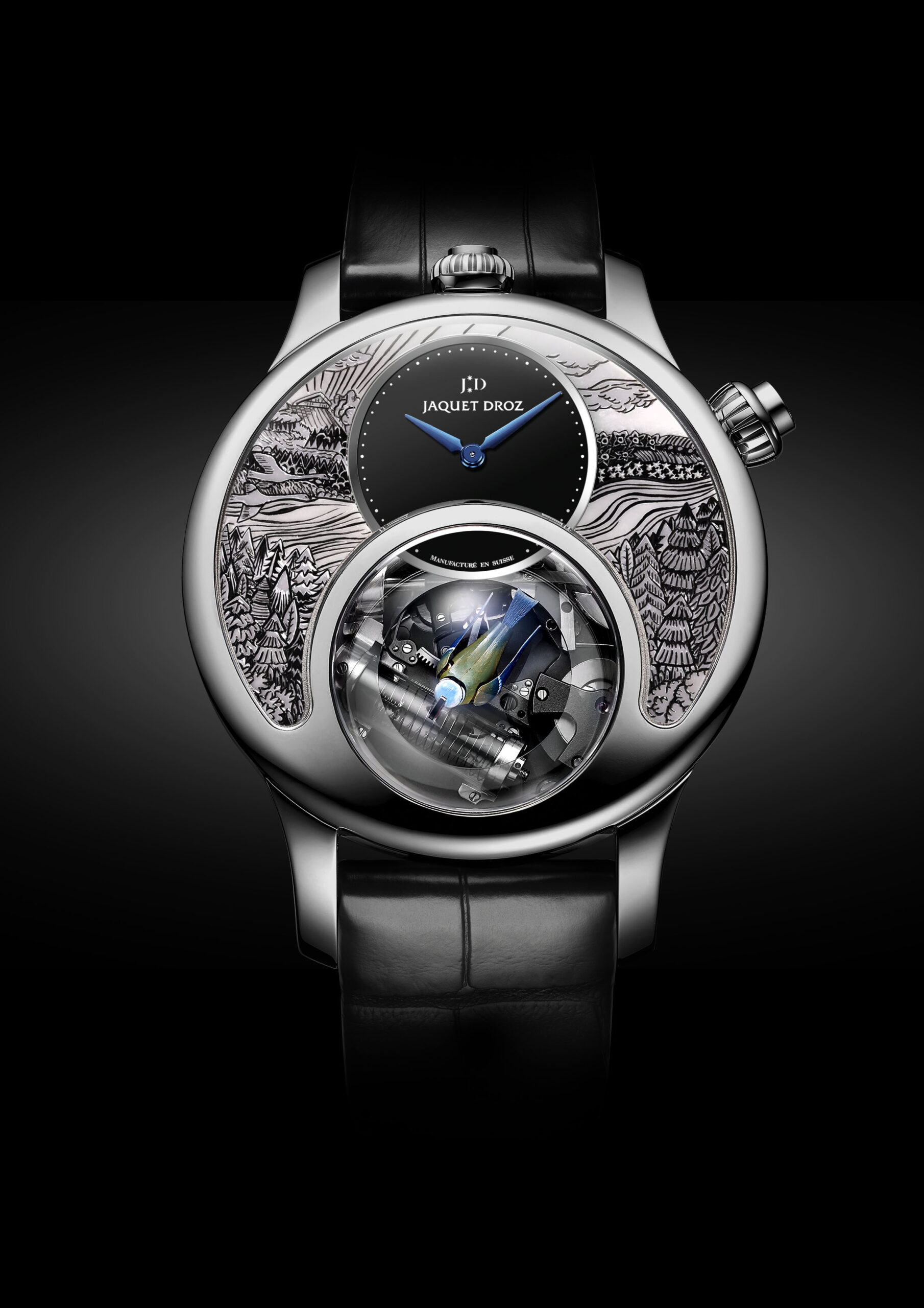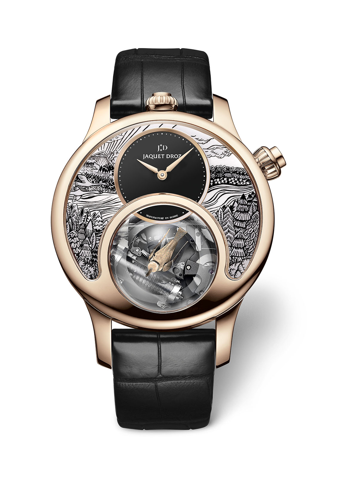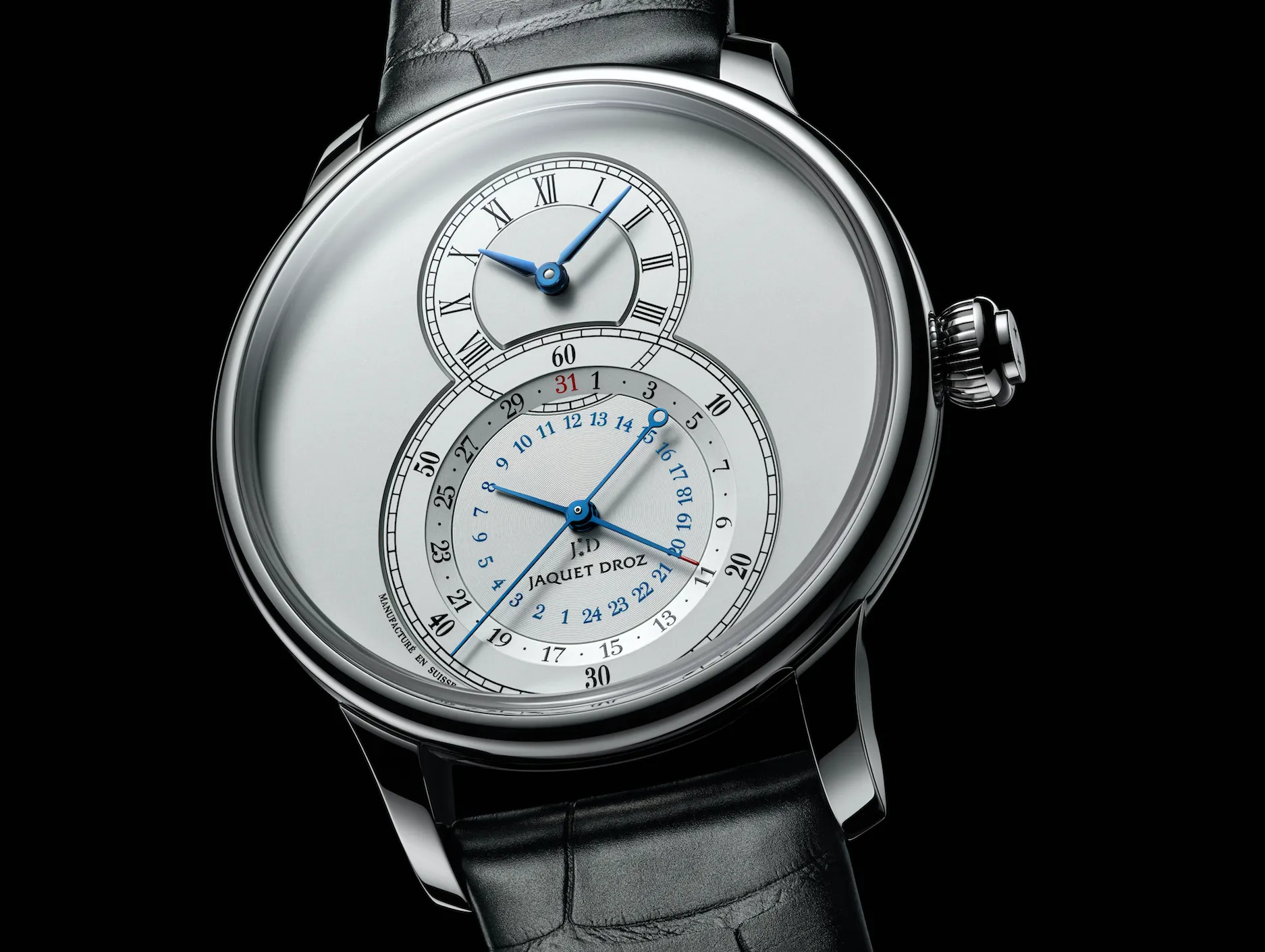 En 2016, la Casa adapta por primera vez este espíritu a una de sus referencias más emblemáticas: el Grande Seconde. Celebrando todas las posibilidades del tiempo, este modelo histórico luce dos esferas descentradas ligeramente superpuestas que forman un ocho, número representativo de Jaquet Droz y símbolo del equilibrio y del infinito. “Hemos desarrollado un nuevo movimiento con el fin de dedicar carátula superior a la indicación de la hora local y de acompañar el subdial de los segundos, descentrándole a las 6, de una segunda carátula de horas y minutos que indica la hora de referencia. Asimismo la fecha es indicada por aguja y finalizamos con un segundero que completa la vuelta a la escena por cada minuto”. La pieza posee escape de silicio a fin de utilizar menos lubricación y resistir a los campos magnéticos.