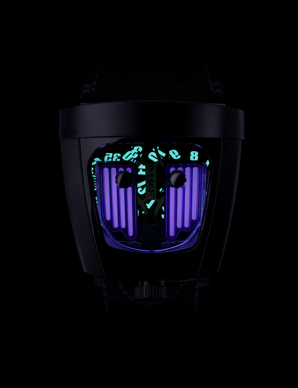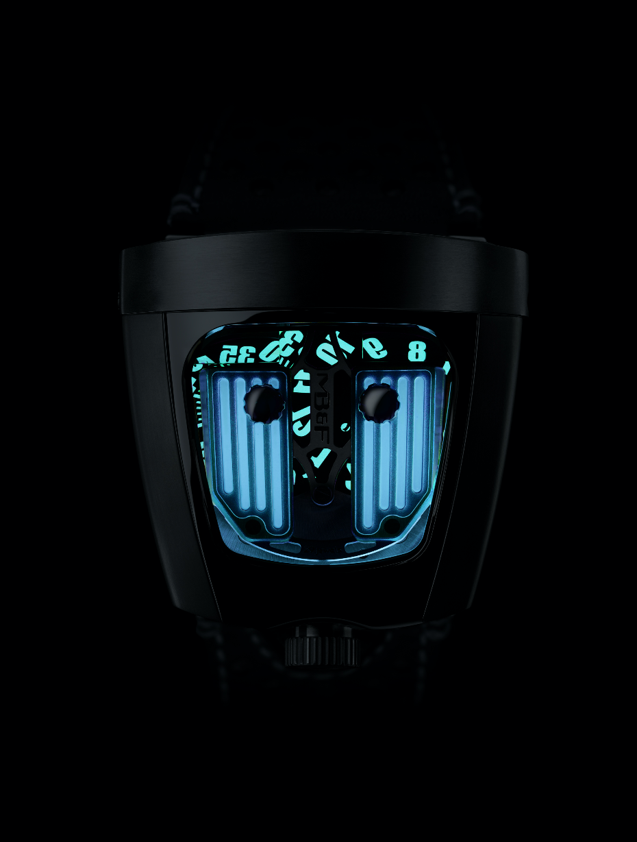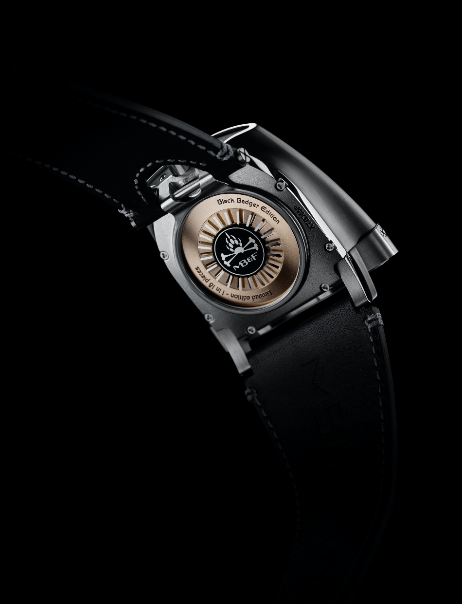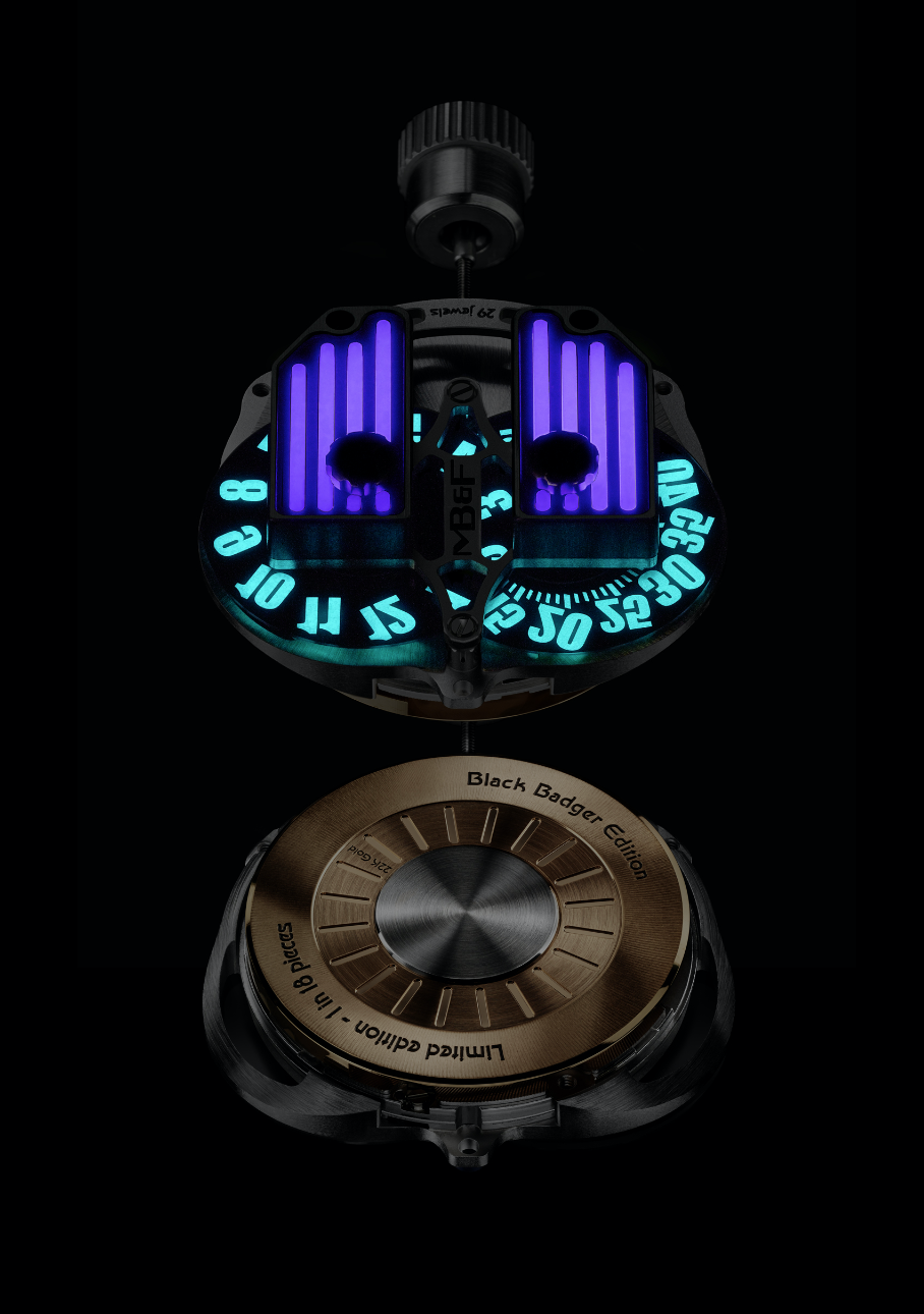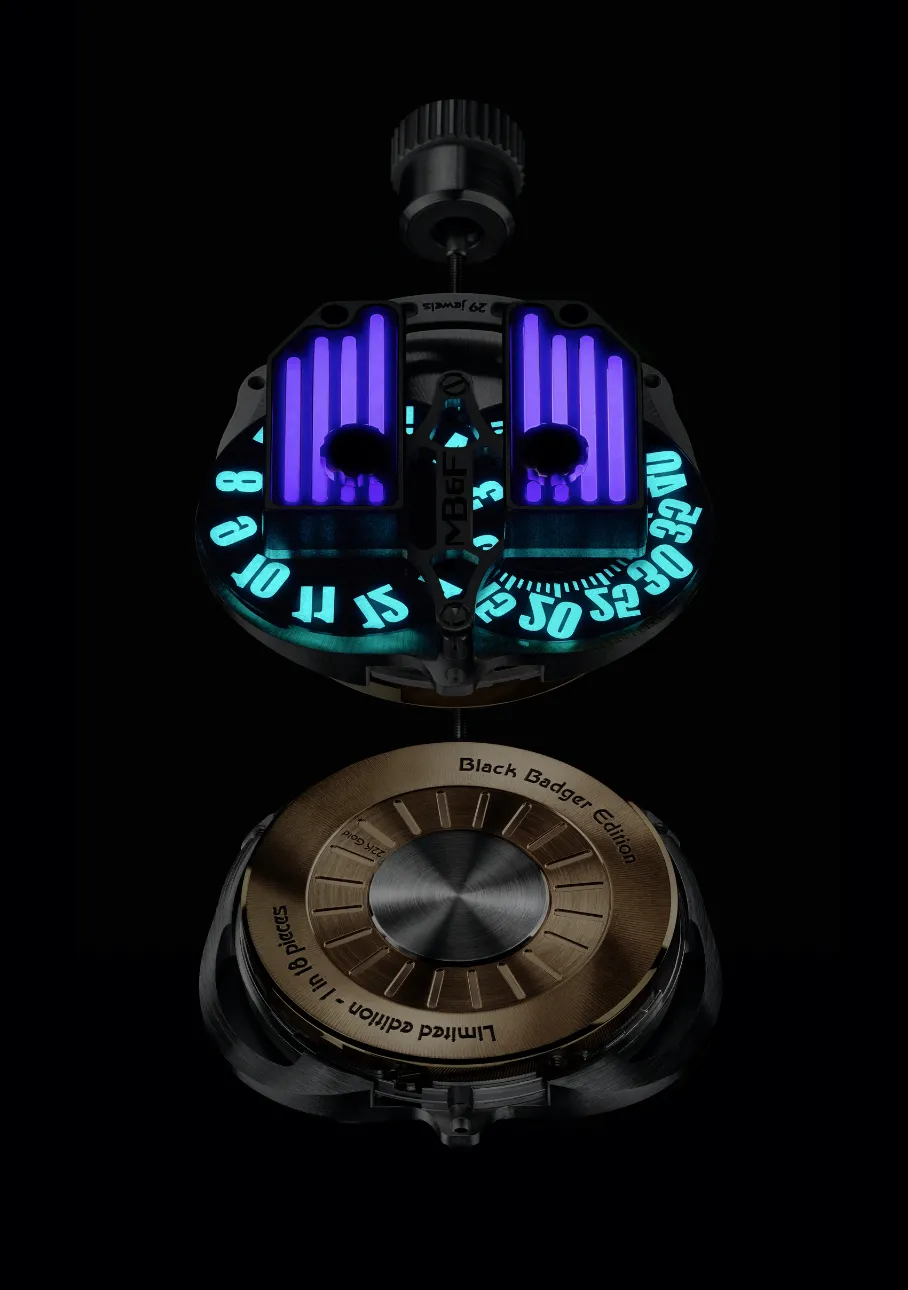 En esta pieza, HMX Black Badger, se rediseñó la tapa de balancines del calibre a fin de ingresar diferentes colores de luz producto de una carga acelerada y un esplendor magistral, superior a cualquier SuperLumiNova® del mercado: radar green, phantom blue espectral y purple reign fueron utilizados para desatar un imán de miradas a la nueva pieza que se ofrecerá en una edición limitada de 3 X 18 para el planeta entero.