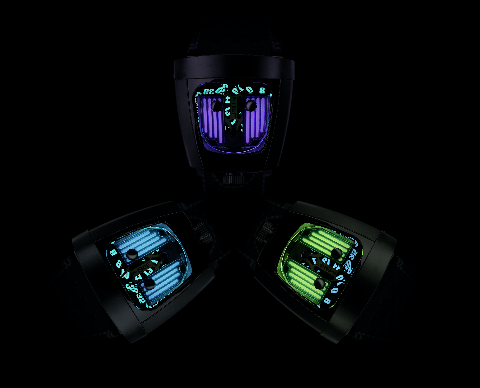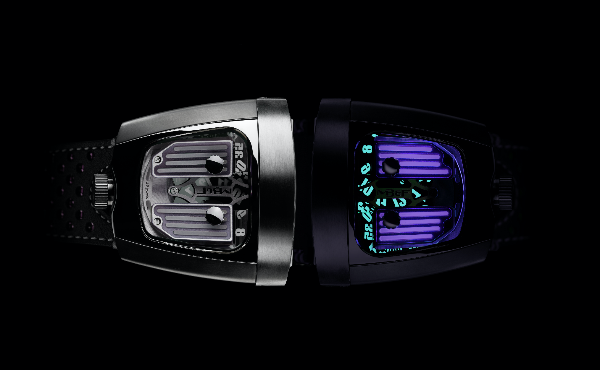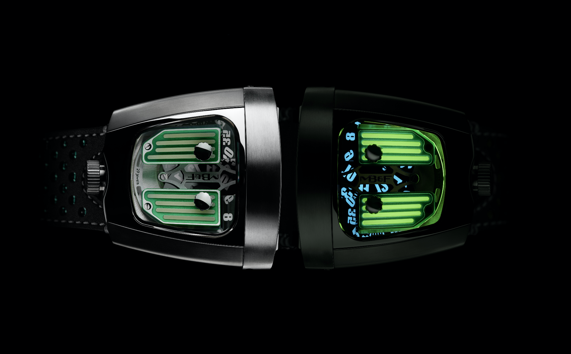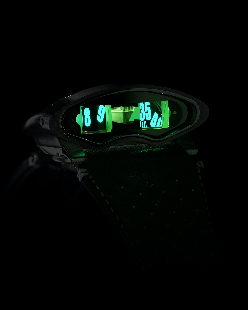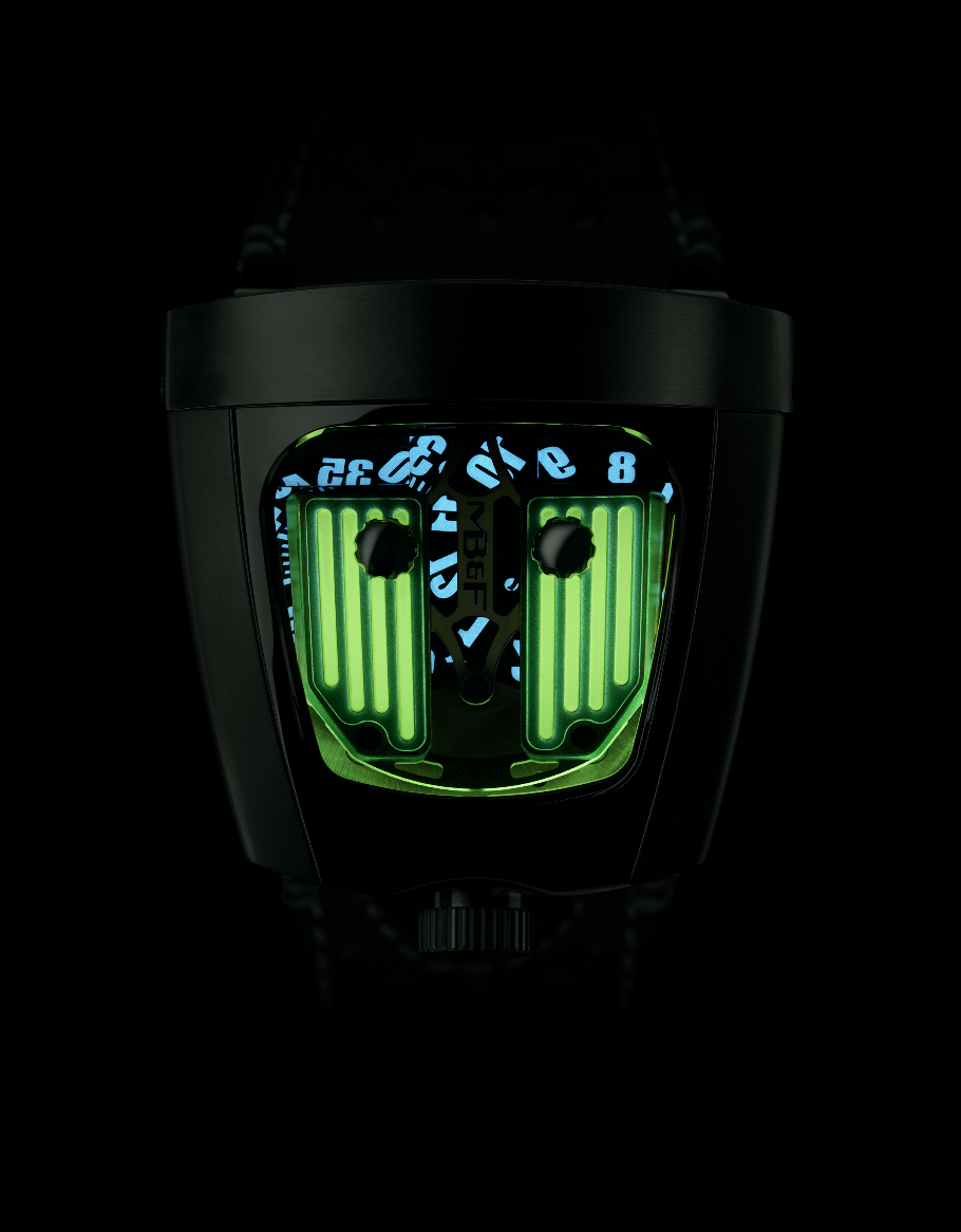 En esta pieza, HMX Black Badger, se rediseñó la tapa de balancines del calibre a fin de ingresar diferentes colores de luz producto de una carga acelerada y un esplendor magistral, superior a cualquier SuperLumiNova® del mercado: radar green, phantom blue espectral y purple reign fueron utilizados para desatar un imán de miradas a la nueva pieza que se ofrecerá en una edición limitada de 3 X 18 para el planeta entero.