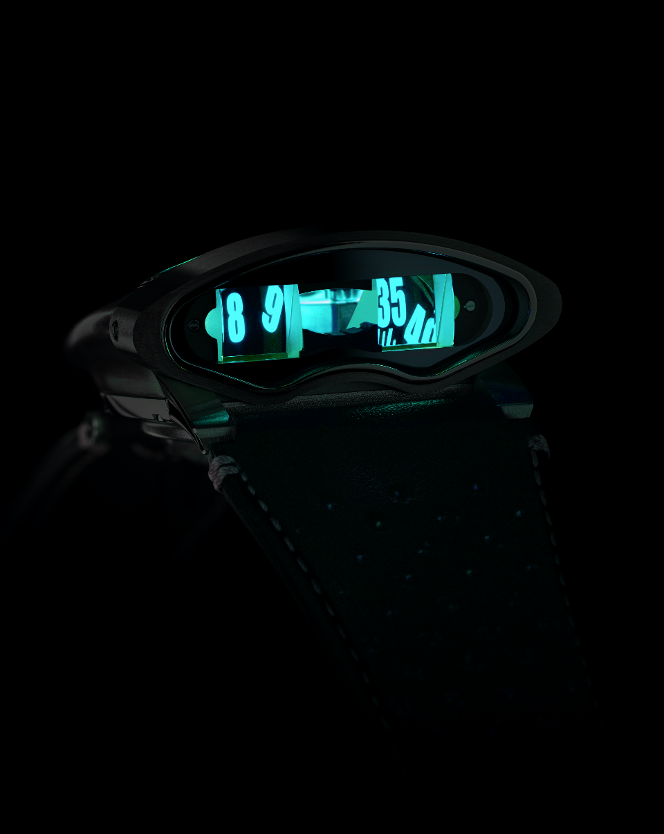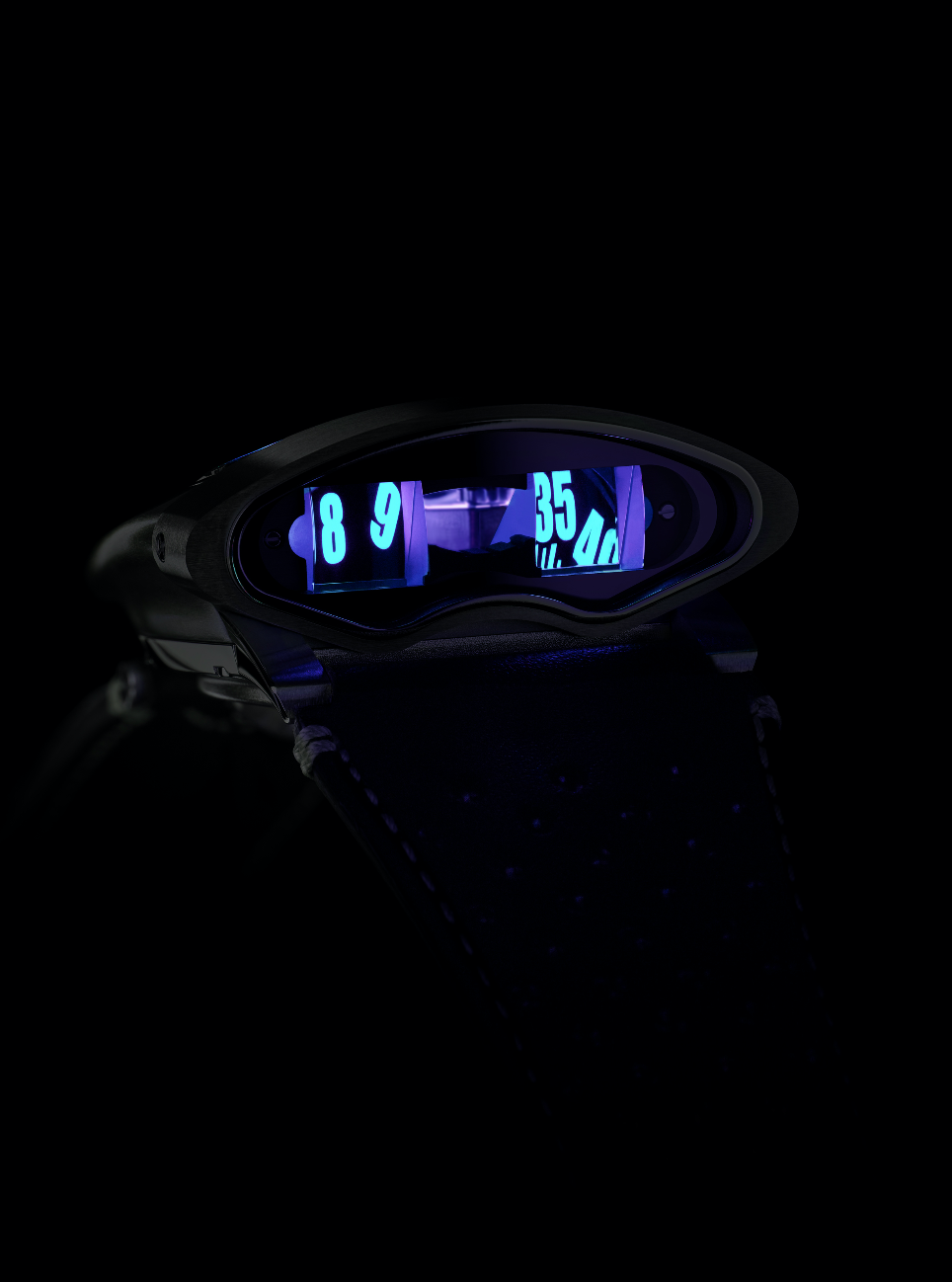 Su caja es de titanio grado 5, mientras que el motor ha sido modificado de un movimiento mecánico de cuerda automática Sellita, para brindar energía a las horas saltantes bidireccionales y minutos con disco de arrastre por –no menos– que 42 horas de autonomía. Cada pieza lucirá espectacular abrazada a la muñeca mediante una correa de piel de becerro perforada a juego con la maquinaria.
