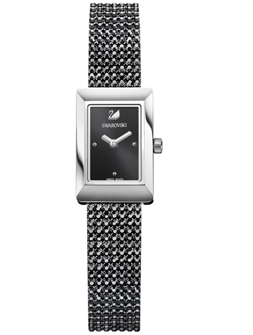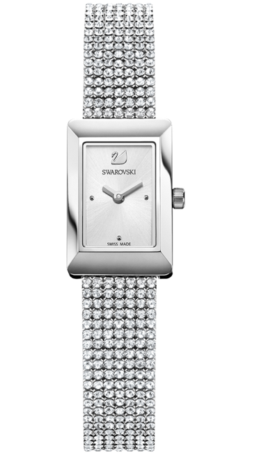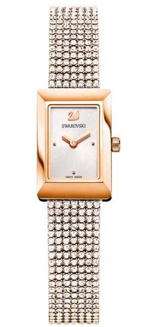 Una caja rectangular como el mejor aliado para ella, que desea diferenciarse de las tendencias circulares de la actualidad. La caja está fabricada en acero inoxidable, y cuenta con tratamiento PVD oro rosa, plateado o negro. Destaca un strap de piel engalanada con Crystal Mesh.