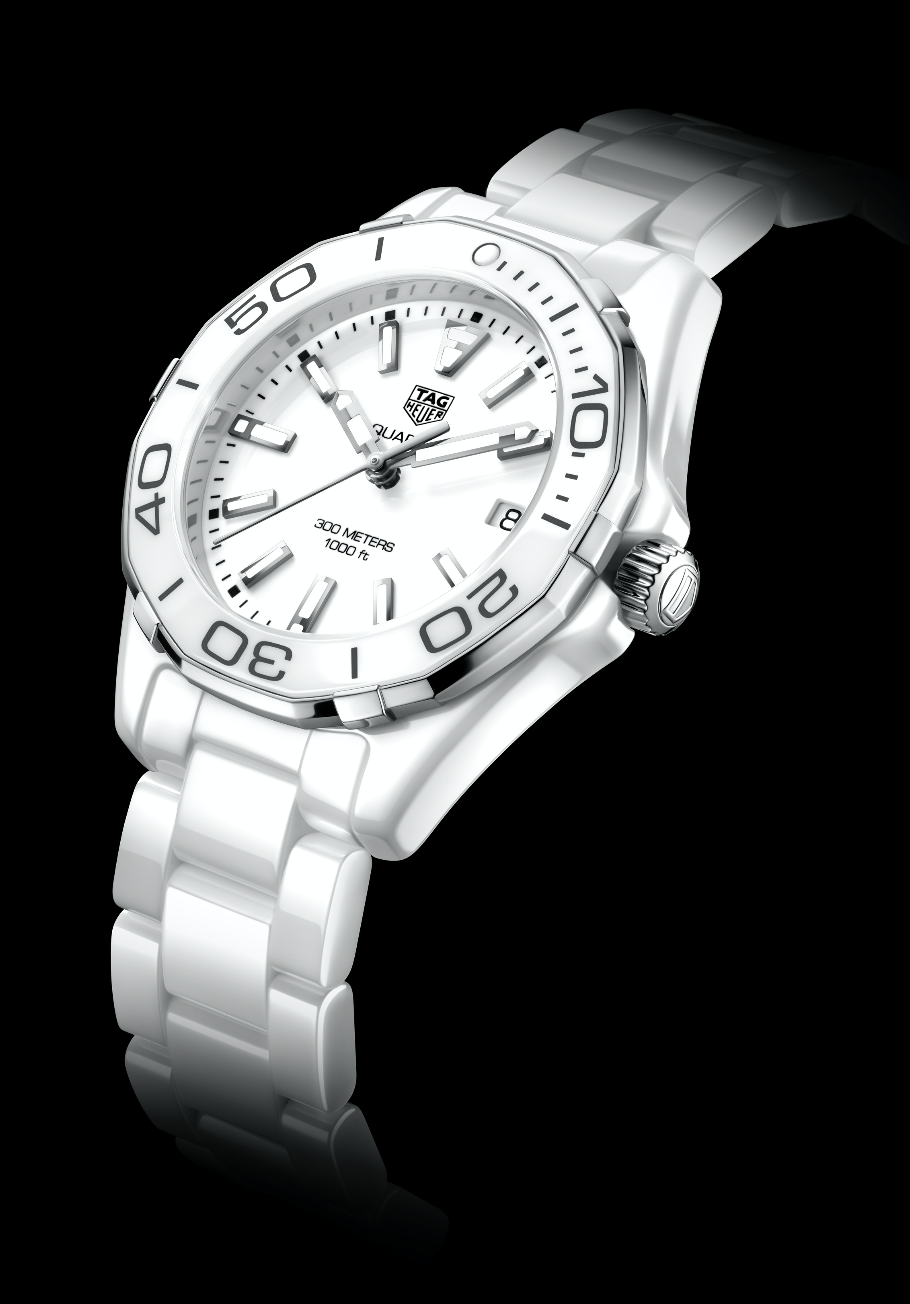 Este 2016, se lanza una nueva colección de Aquaracer Lady 300 Metros, la cual está construida por vez primera en cerámica –totalmente– blanca o negra, de acuerdo a su predilección, y en un robusto y agresivo tamaño: 35 milímetros para la caja. Al interior late un calibre de cuarzo, mientras que las configuraciones estéticas van desde el bisel giratorio unidireccional de acero y cerámica blanca, o de PVD negro con anillo de oro rosa, o de acero y cerámica negra con diamantes, números grabados y lacados en plata (para las versiones negras). Asimismo la versión en color negro con diamantes, cuenta con 60 de estos minerales.
