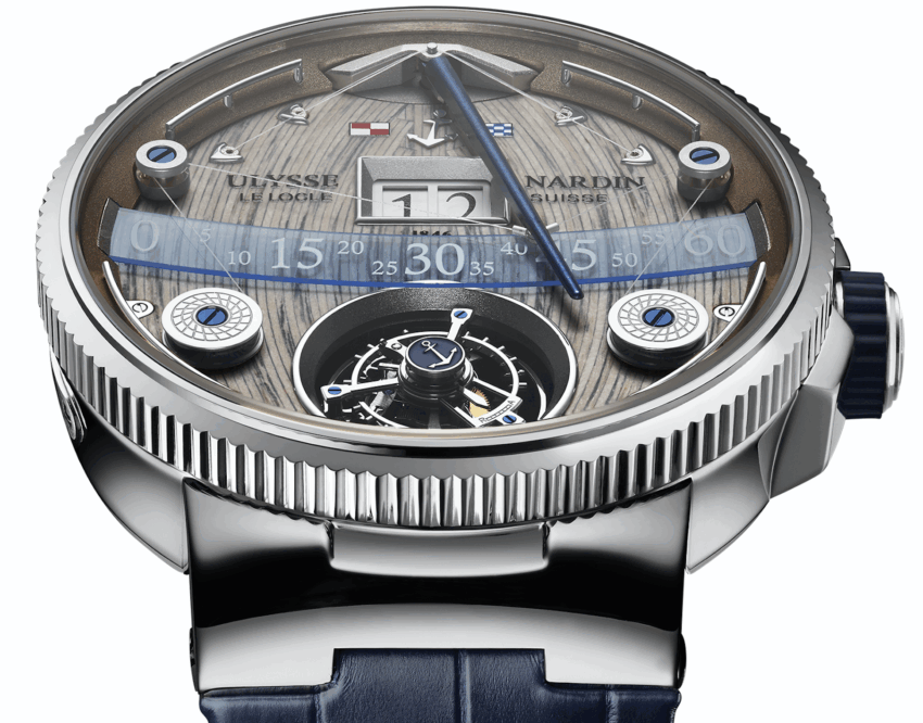 El reloj estelar de Baselworld para la marca, lo presentó nuestro amigo Patrik Hoffmann, CEO de la marca, como una de las piezas más importantes en el año. Vinculado a un movimiento calibre UN-630 con tourbillon volante de 60 segundos (indicación de segundero). Este sistema patentado es guiado por una fibra de alta tecnología sumamente resistente, pero más delgado que el cabello de un humano. Prácticamente una botavara que fascina desde las 12 h, irá de izquierda a derecha gracias a un movimiento desarrollado por Christophe Claret con la colaboración del equipo de Ulysse Nardin. Asimismo, la pieza se inspira en las embarcaciones náuticas, por lo que su carátula reinventa los códigos relojeros con una carátula que replica una cubierta marina hecha de madera real.