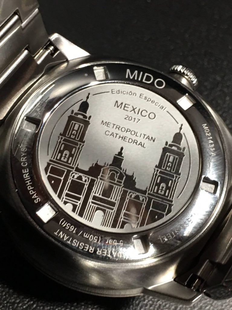 Este año, se hace eco a uno de los mercados mas grandes de Mido en el mundo, México como tercero en importancia, recibe una pieza que sigue en el tributo a la arquitectura mundial de inspiración para Mido con un Commander Edición Especial 2017 “Catedral Metropolitana México”. En su carátula a las 12 la inspiración de la torre central de la catedral al mismo tiempo que en su fondo se graba toda la fachada de la catedral y la inscripción de edición especial.